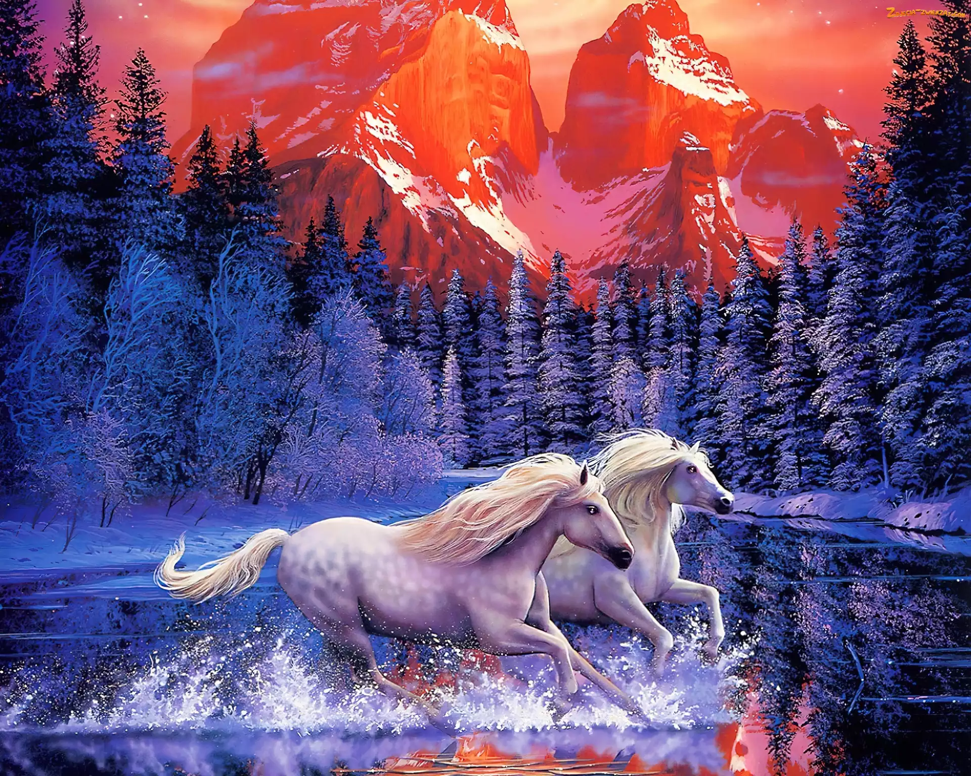 Zdjęcie: Rzeka, Góry, Konie, Dwa, Las