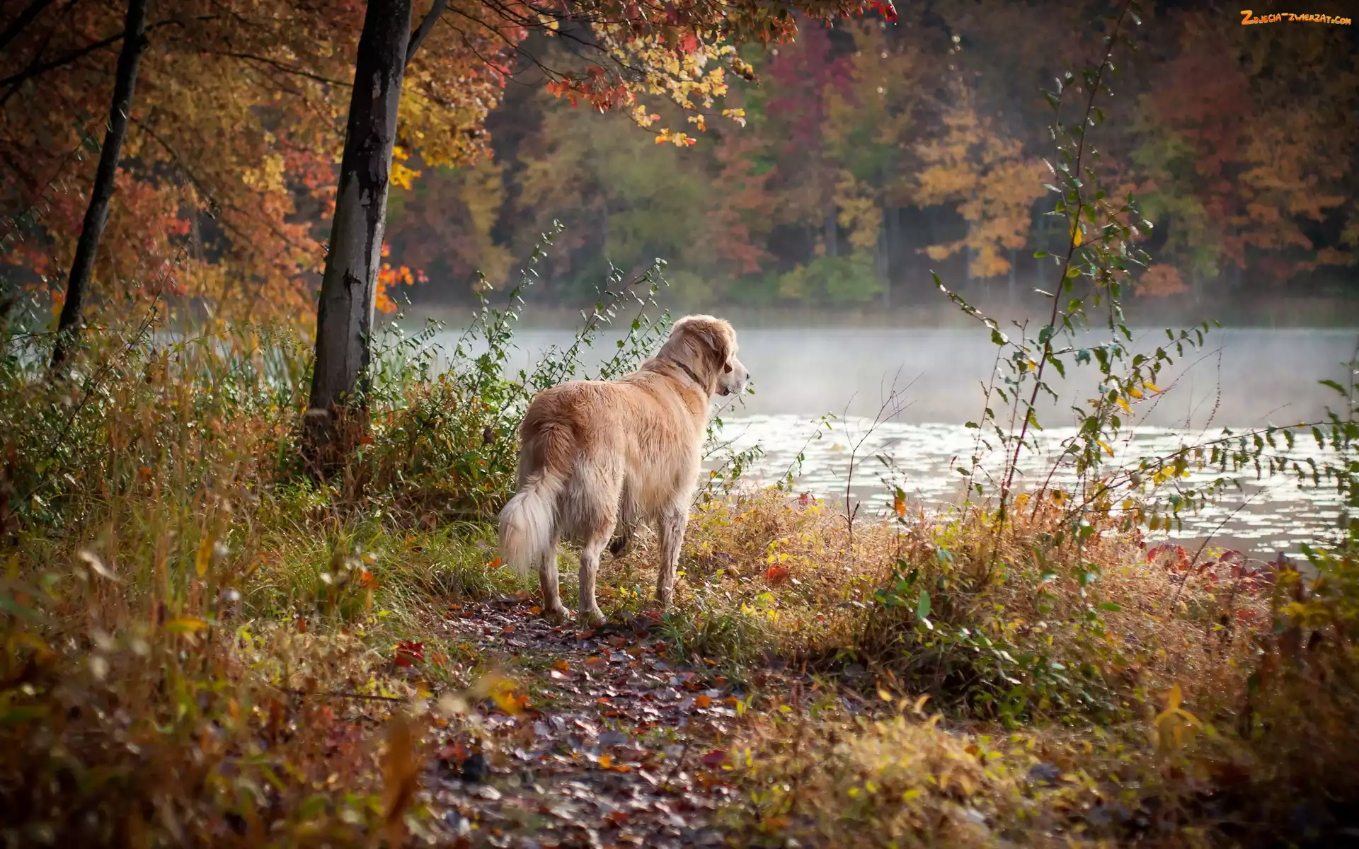 Zdjęcie: Golden Retriever, Jesień, Rzeka, Pies, Las