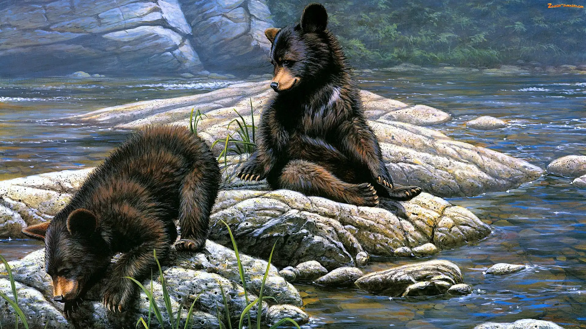 Zdjęcie: Paco Young, Skały, Dwa, Malarstwo, Obraz, Niedźwiedzie czarne, Rzeka