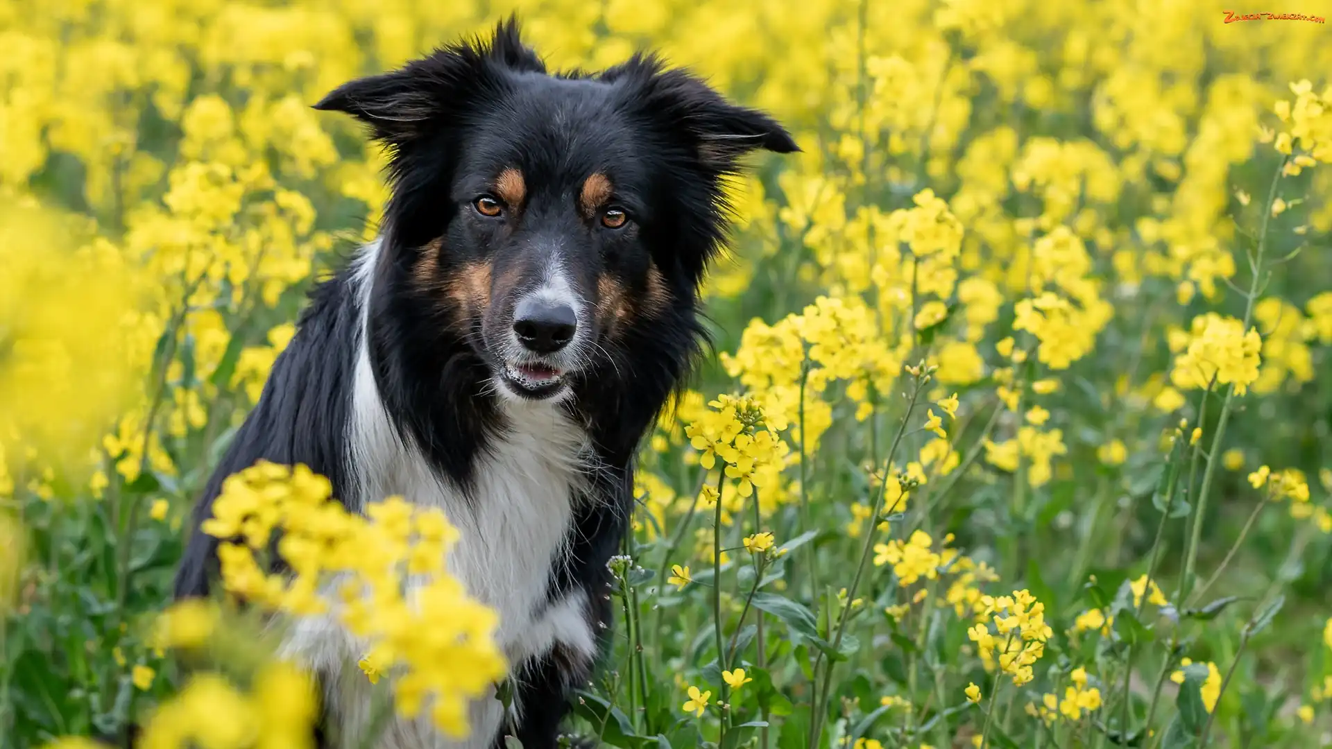 Zdjęcie: Rzepak, Kwiaty, Border collie, Pies, Żółte