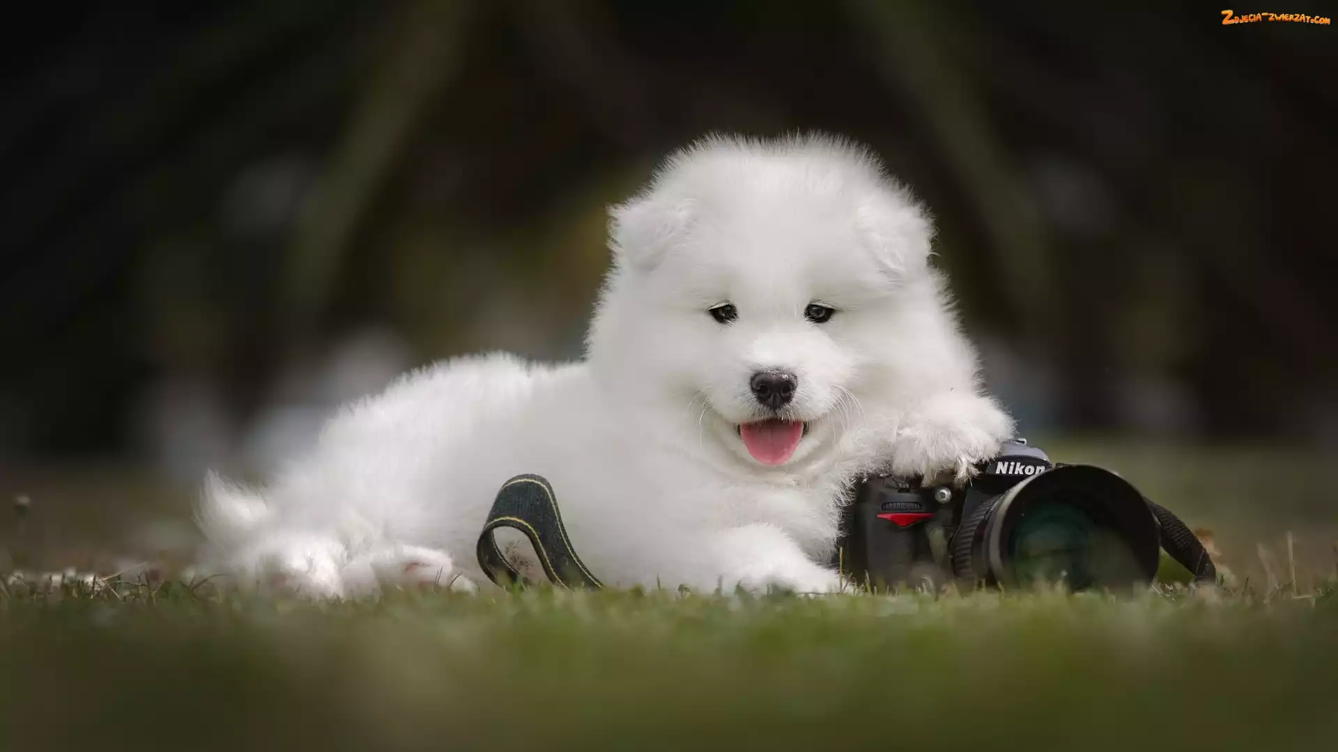 Zdjęcie: Pies, Samojed, Aparat fotograficzny, Szczeniak