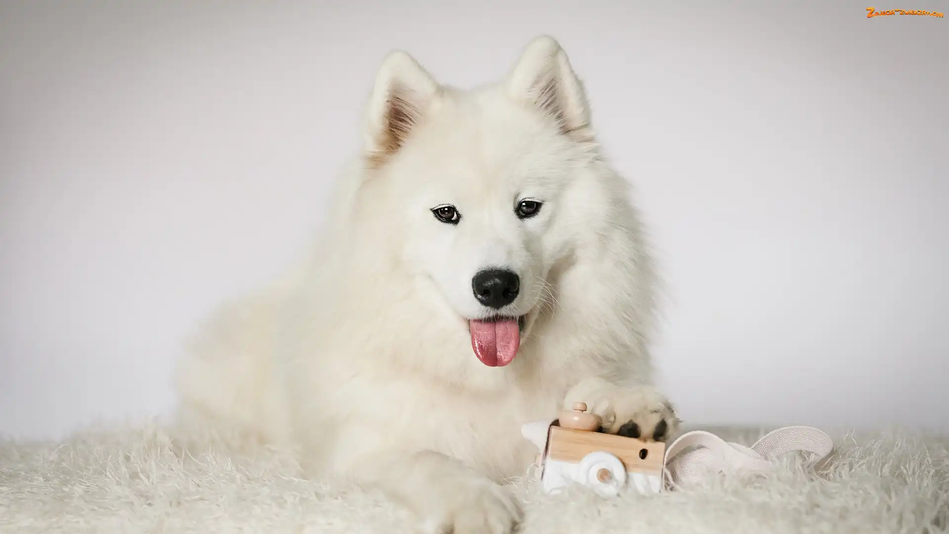 Zdjęcie: Samojed, Biały, Zabawka, Mordka, Pies, Język