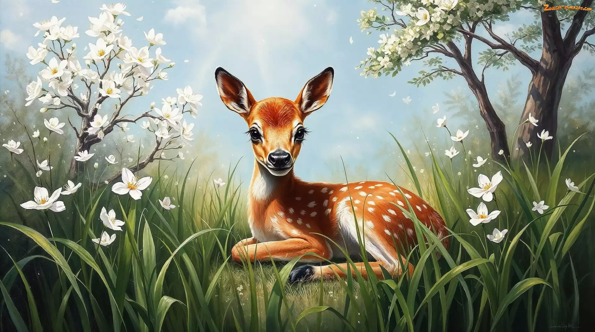 Zdjęcie: Grafika, Trawa, Sarenka, Sarna, Kwiaty, Drzewo