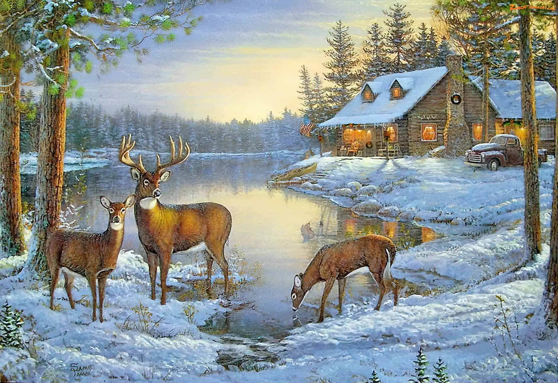 Zdjęcie: Sarny, Jeleń, Jezioro, Domek, Zima