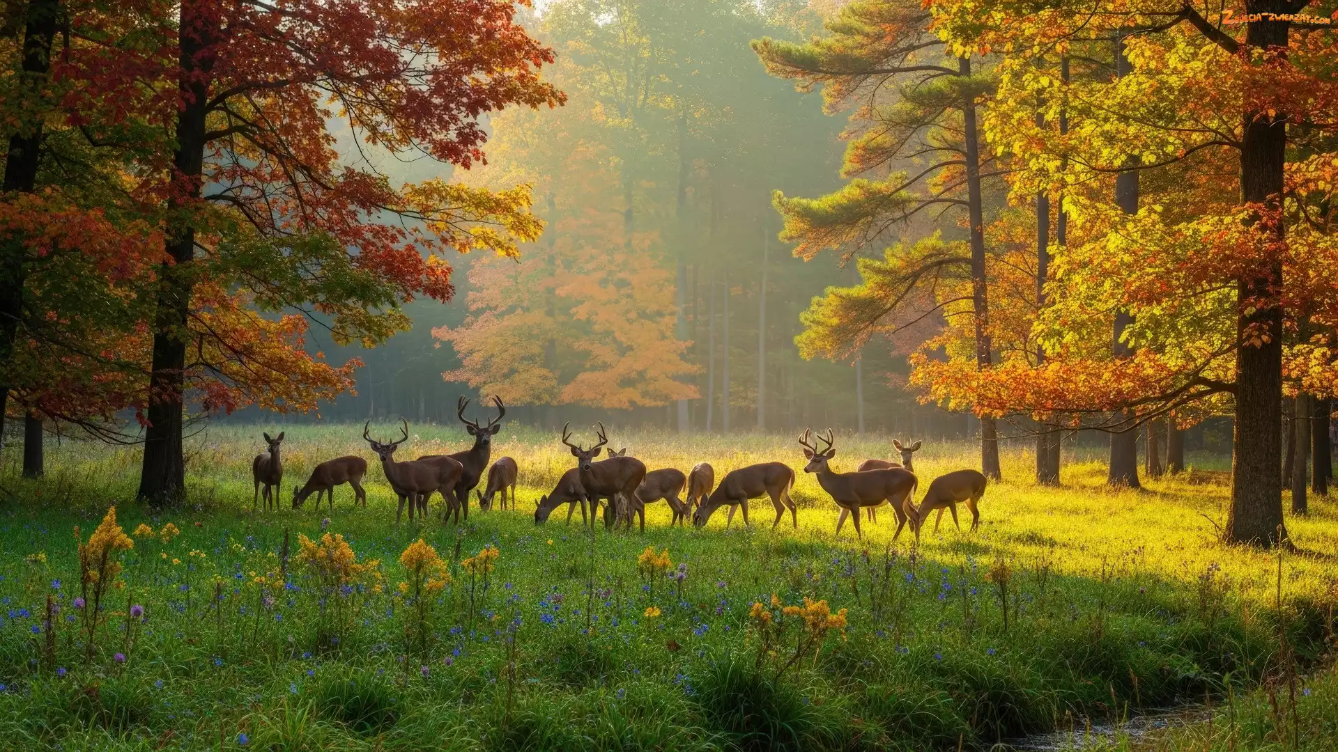 Las, Jelenie, Jesień, Sarny, Polana, Drzewa