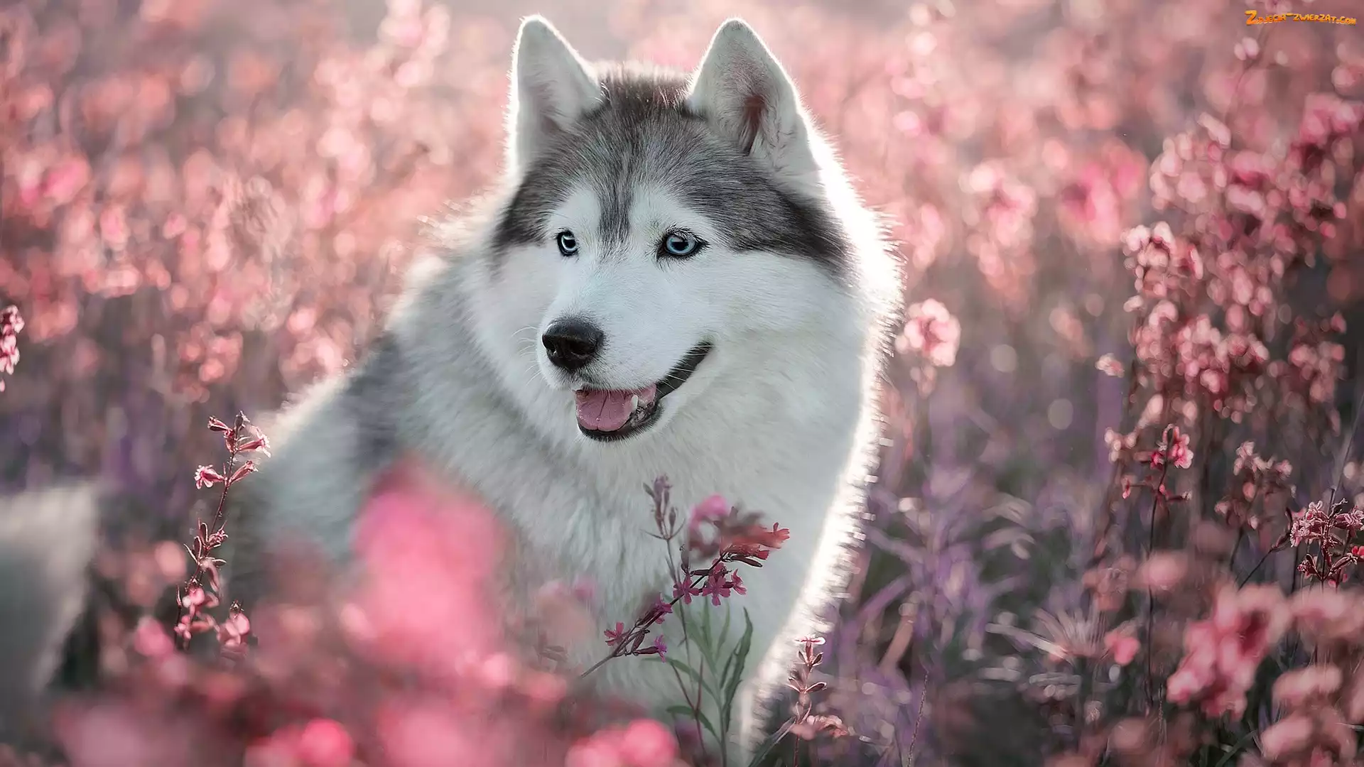 Zdjęcie: Pies, Siberian husky, Kwiaty, Różowe