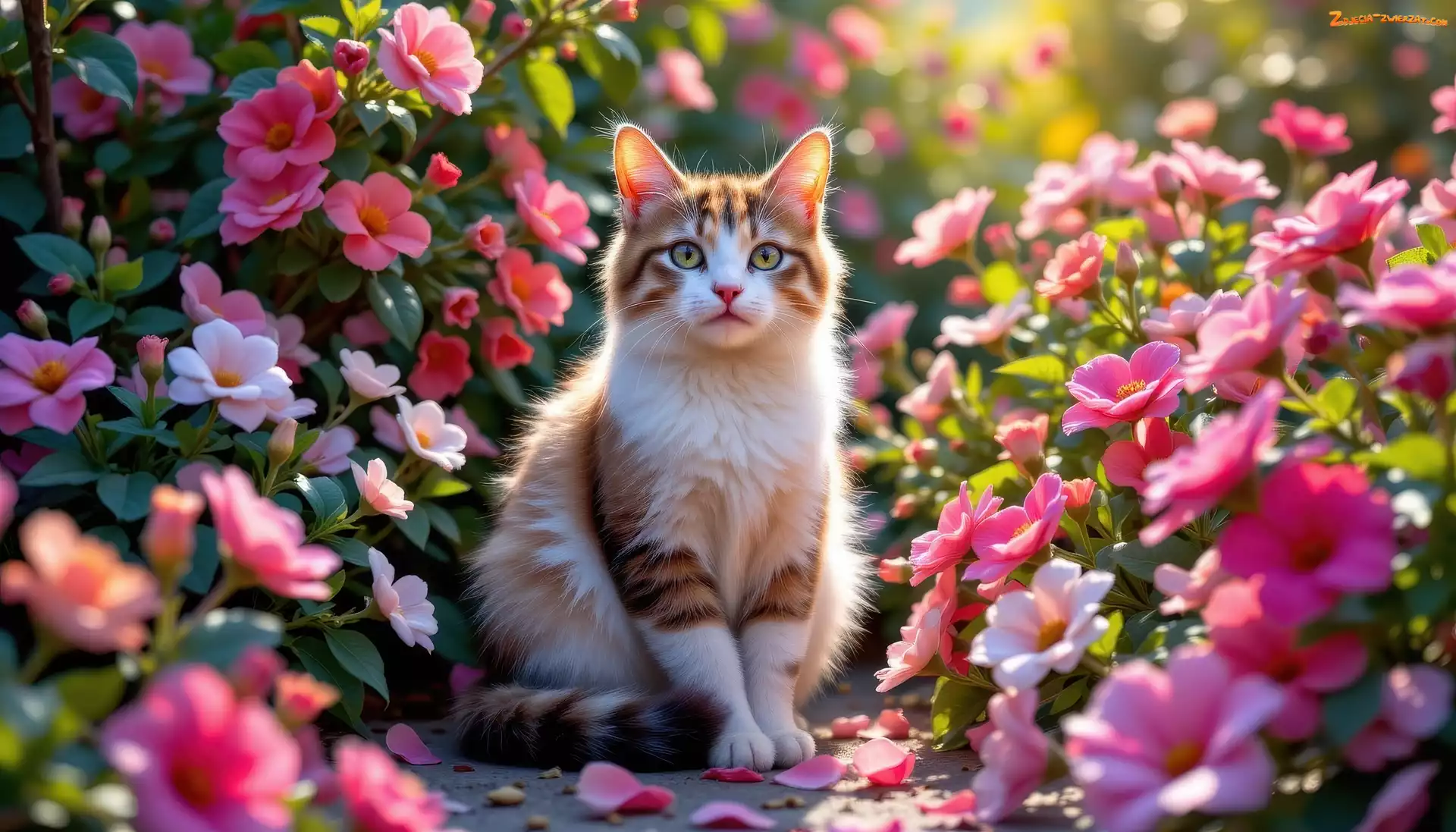 Zdjęcie: Spojrzenie, Kot, Kwiaty, Siedzący, Rudo-biały