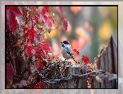 Grafika AI, Płot, Sikorka, Sosnówka, Czerwone, Liście