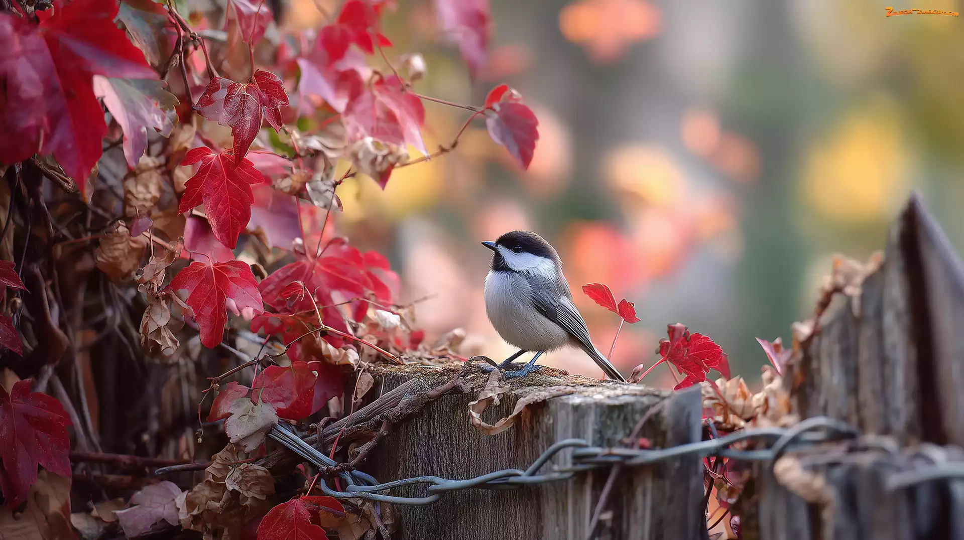 Zdjęcie: Grafika AI, Płot, Sikorka, Sosnówka, Czerwone, Liście