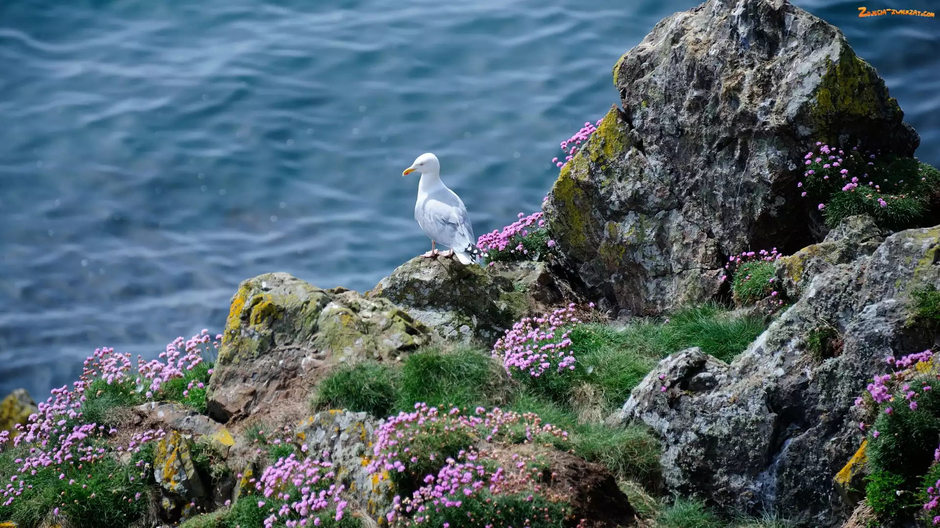 Zdjęcie: Skała, Morze, Mewa, Ptak, Trawa, Kwiaty