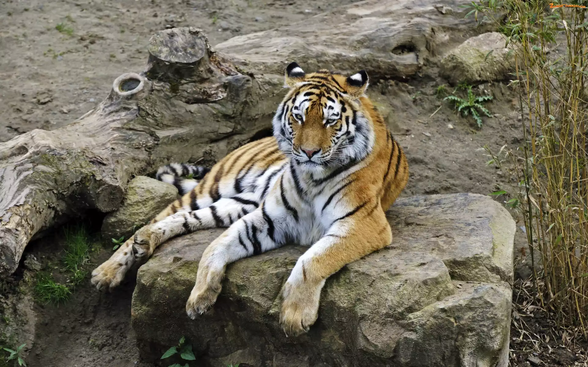 Zdjęcie: Skała, Pień, Tygrys, Trawa