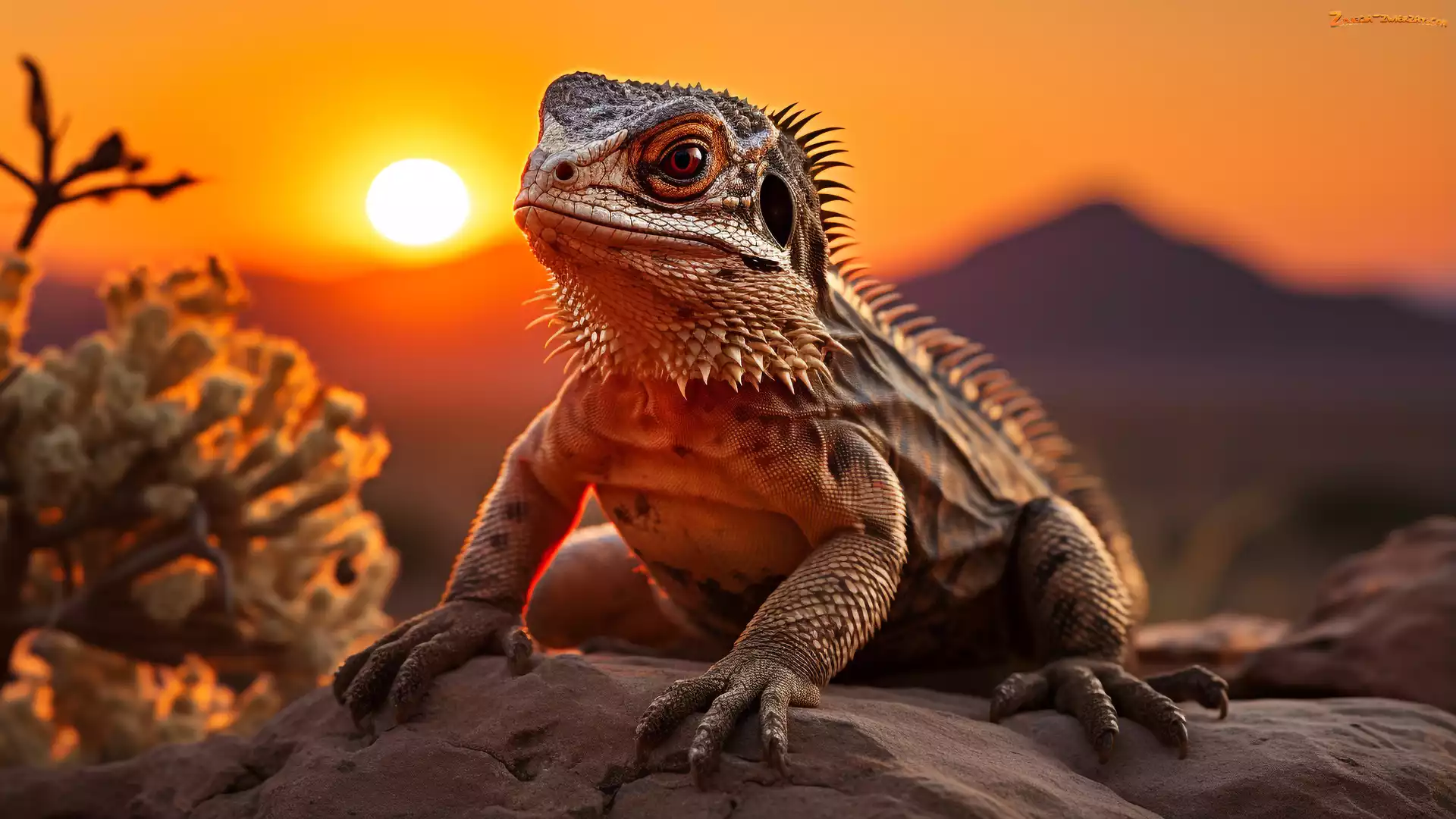 Zdjęcie: Legwan, Skała, Zachód słońca, Zbliżenie