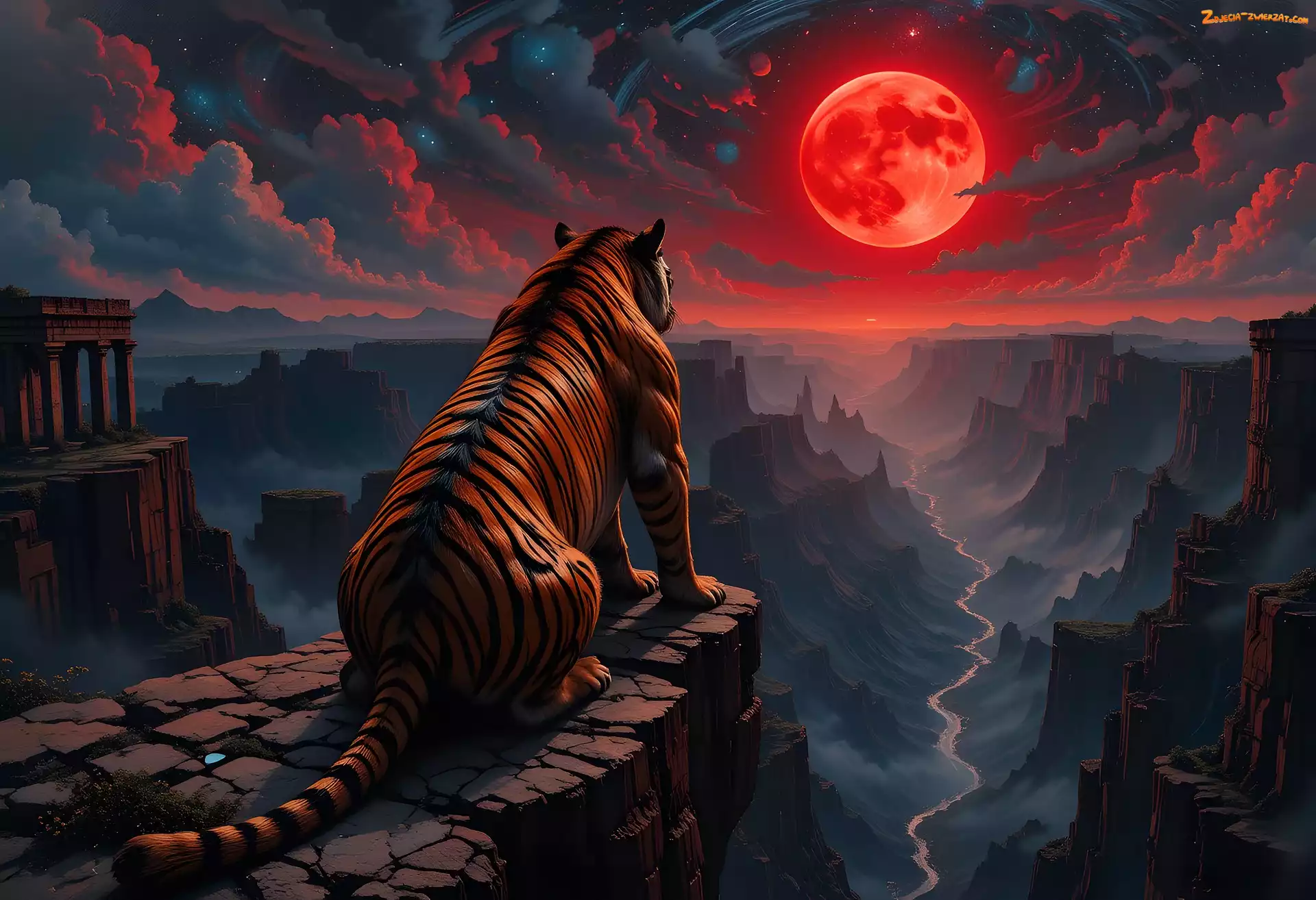 Zdjęcie: Tygrys, Grafika, Góry, Skały, Księżyc, Kanion, Noc