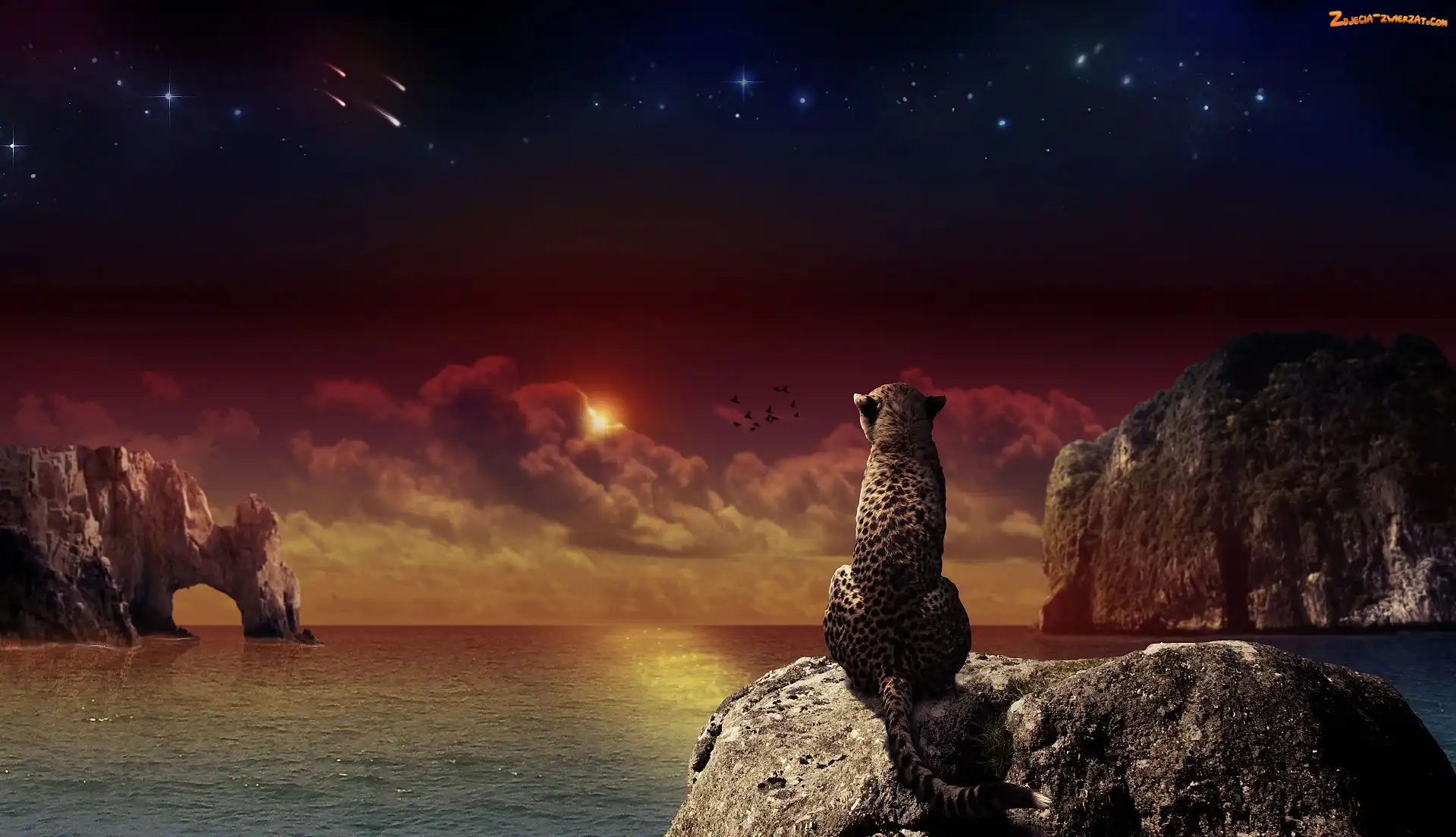 Skały, Ptaki, Lampart, Woda