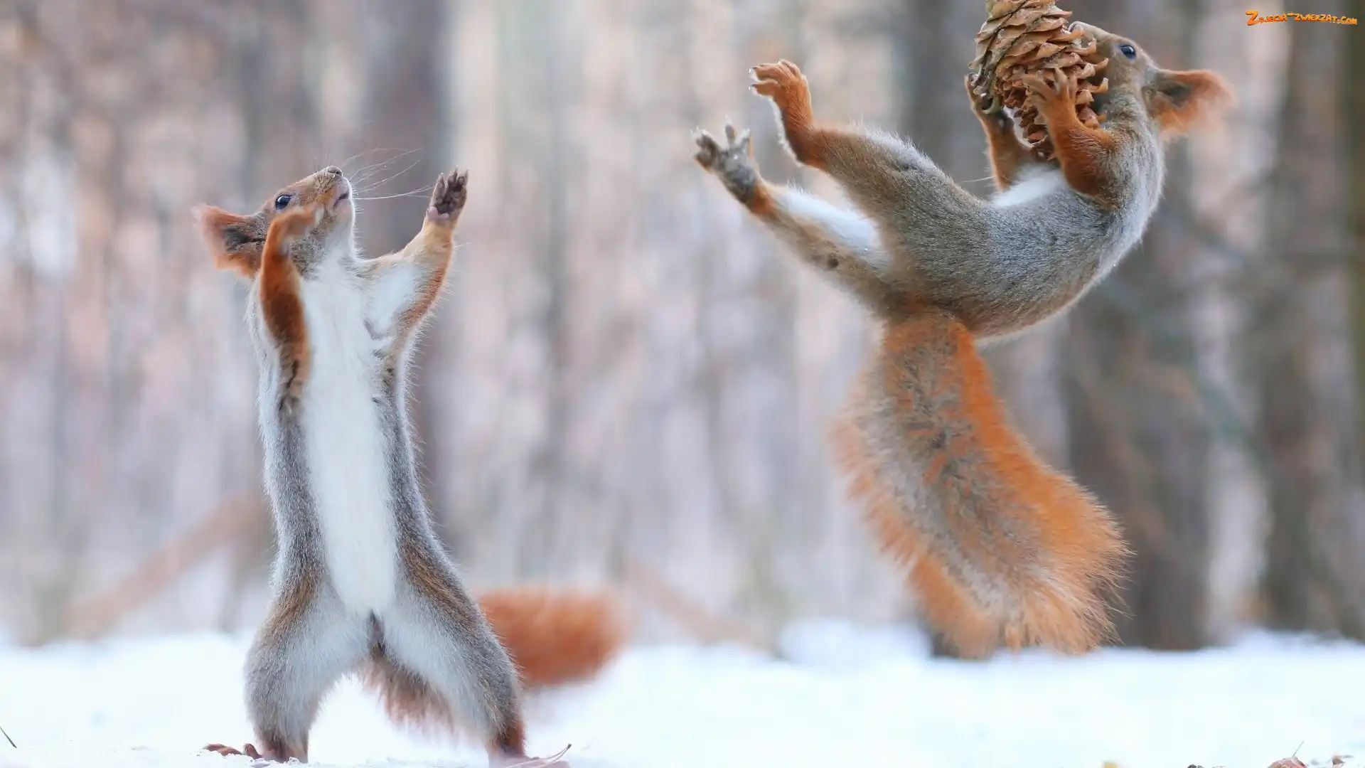 Zdjęcie: Skok, Szyszka, Wiewiórki, Dwie, Zima