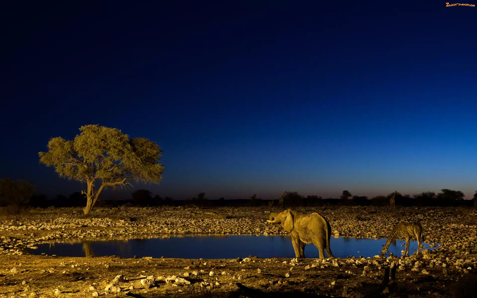 Żyrafy, Drzewa, Słoń, Wodopój