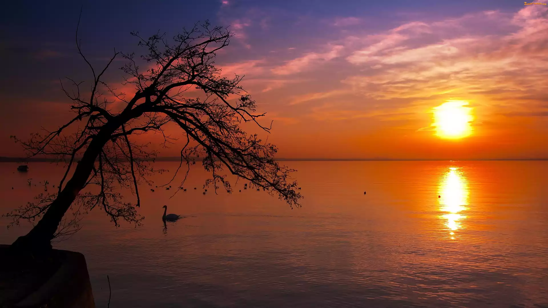 Słońca, Wschód, Jezioro, Łabędzie, Drzewo