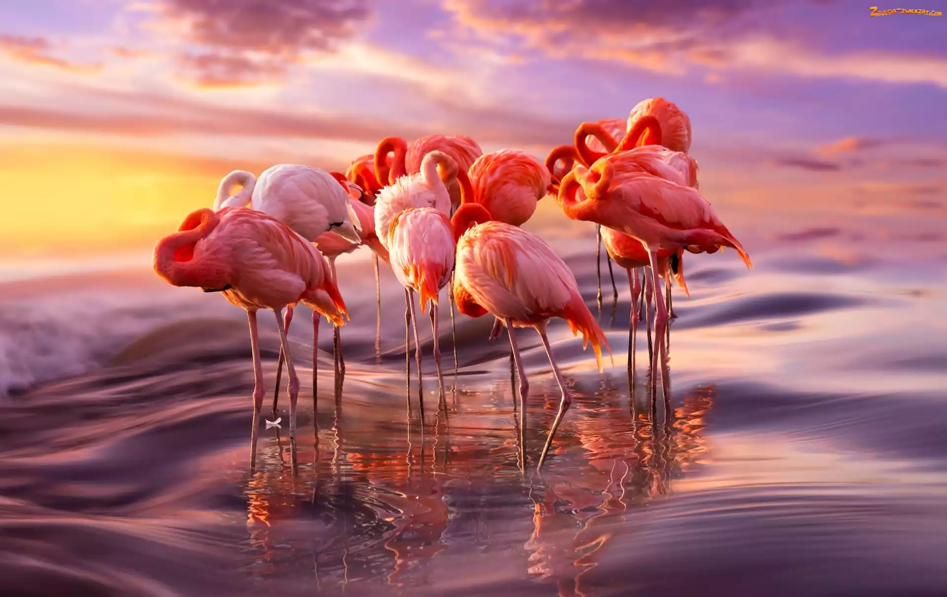 Zdjęcie: Wschód Słońca, Flamingi, Morze