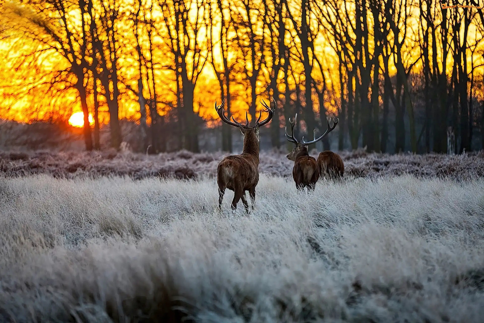Słońca, Zachód, Las, Jelenie, Łąka