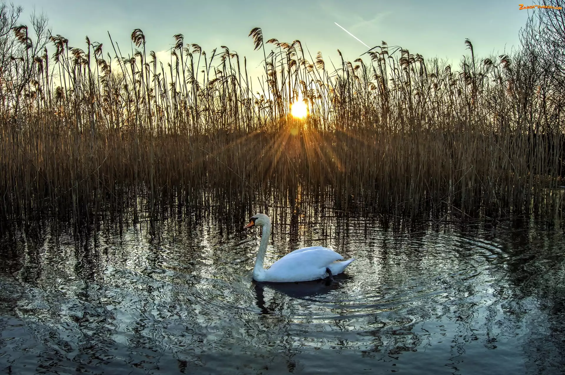 Zdjęcie: Słońca, Zachód, Trawy, Jezioro, Łabędź