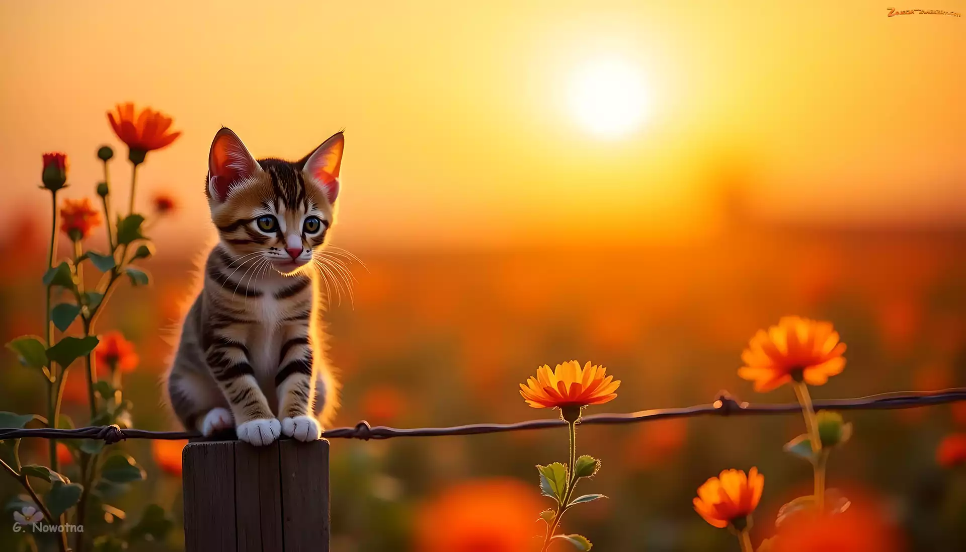 Zdjęcie: Grafika AI, Kołek, Kotek, Kot, Kwiat, Zachód słońca
