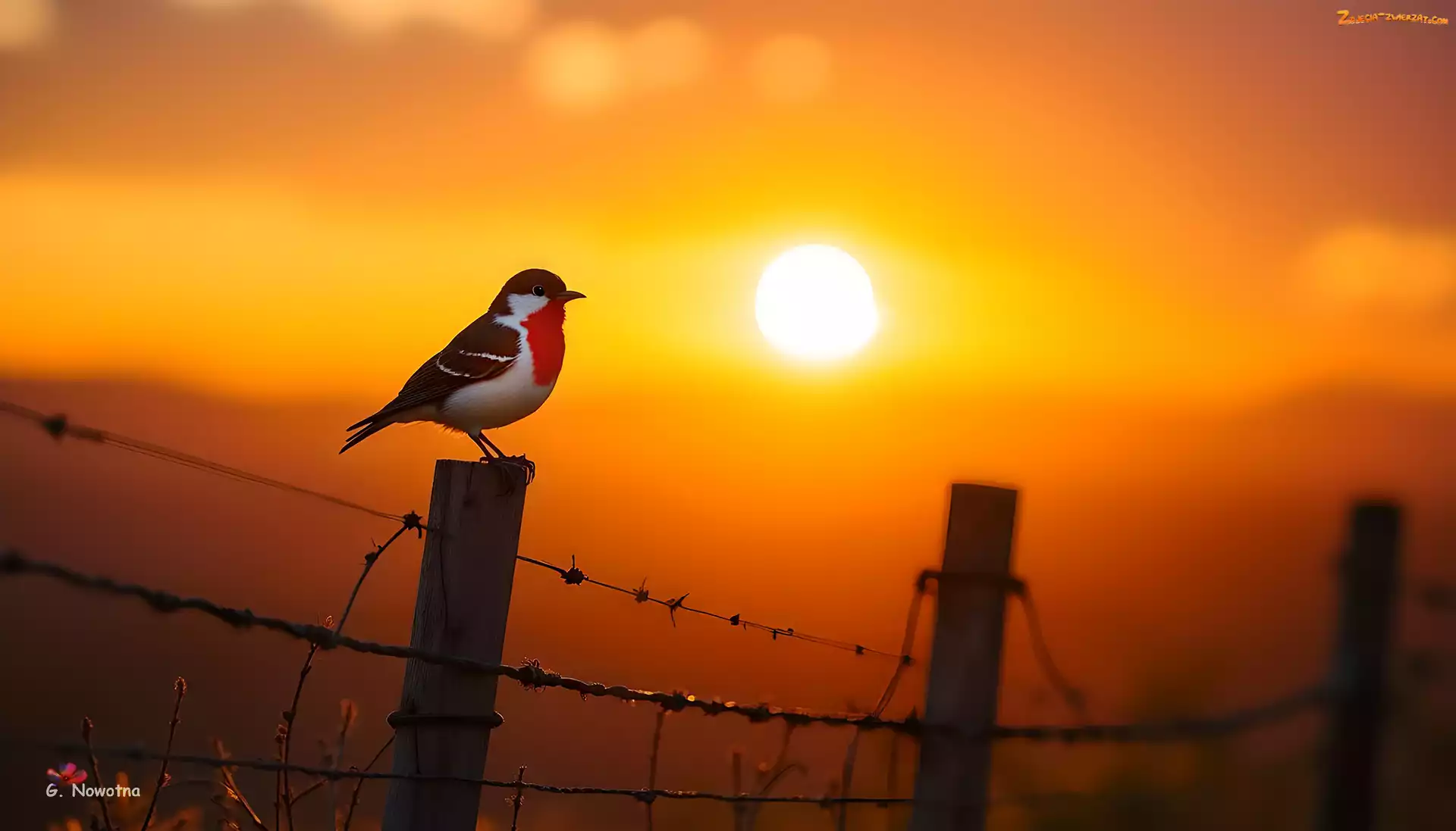 Zdjęcie: Grafika AI, Kołki, Ptak, Płot, Druty, Zachód słońca