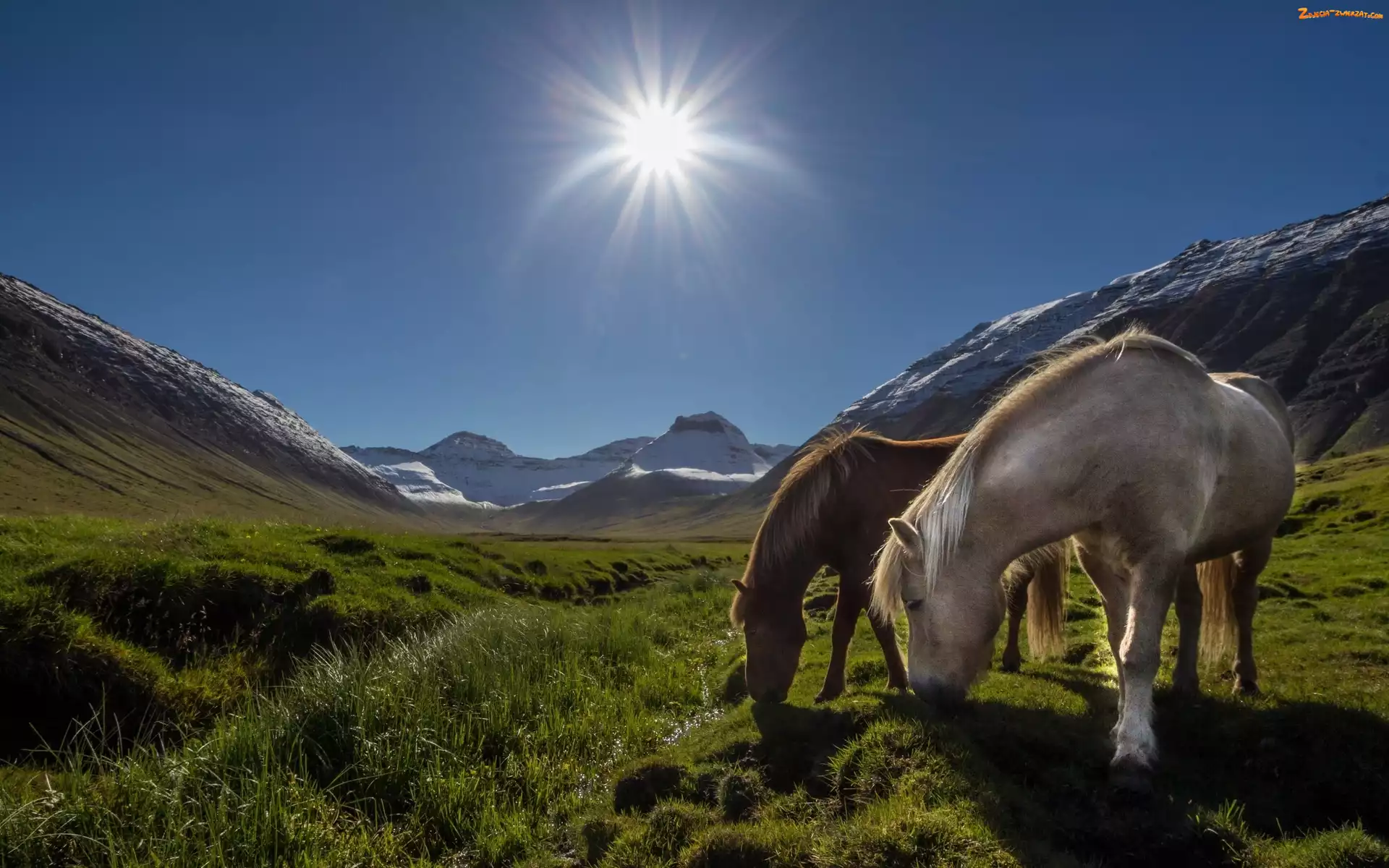 Słońca, Promienie, Góry, Konie, Pastwiska