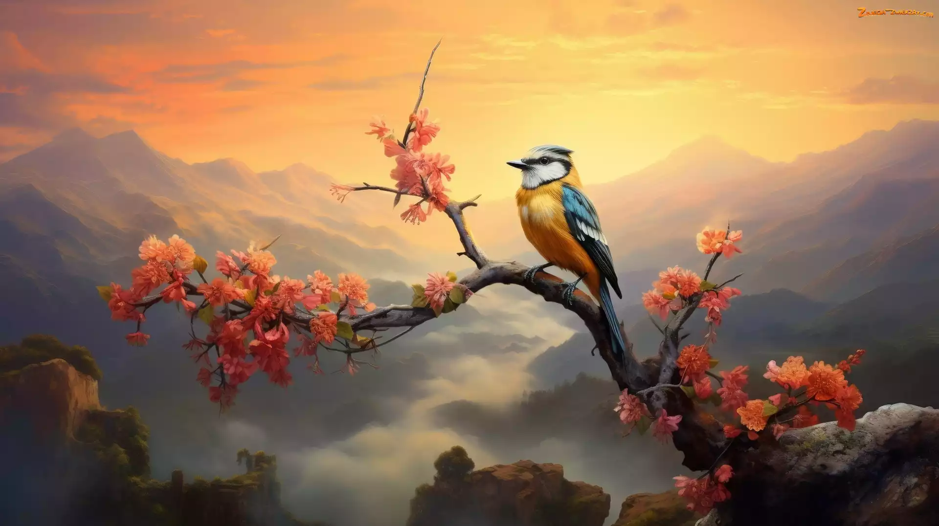 Zdjęcie: Góry, Gałąź, Zachód słońca, Ptak, Kwiaty