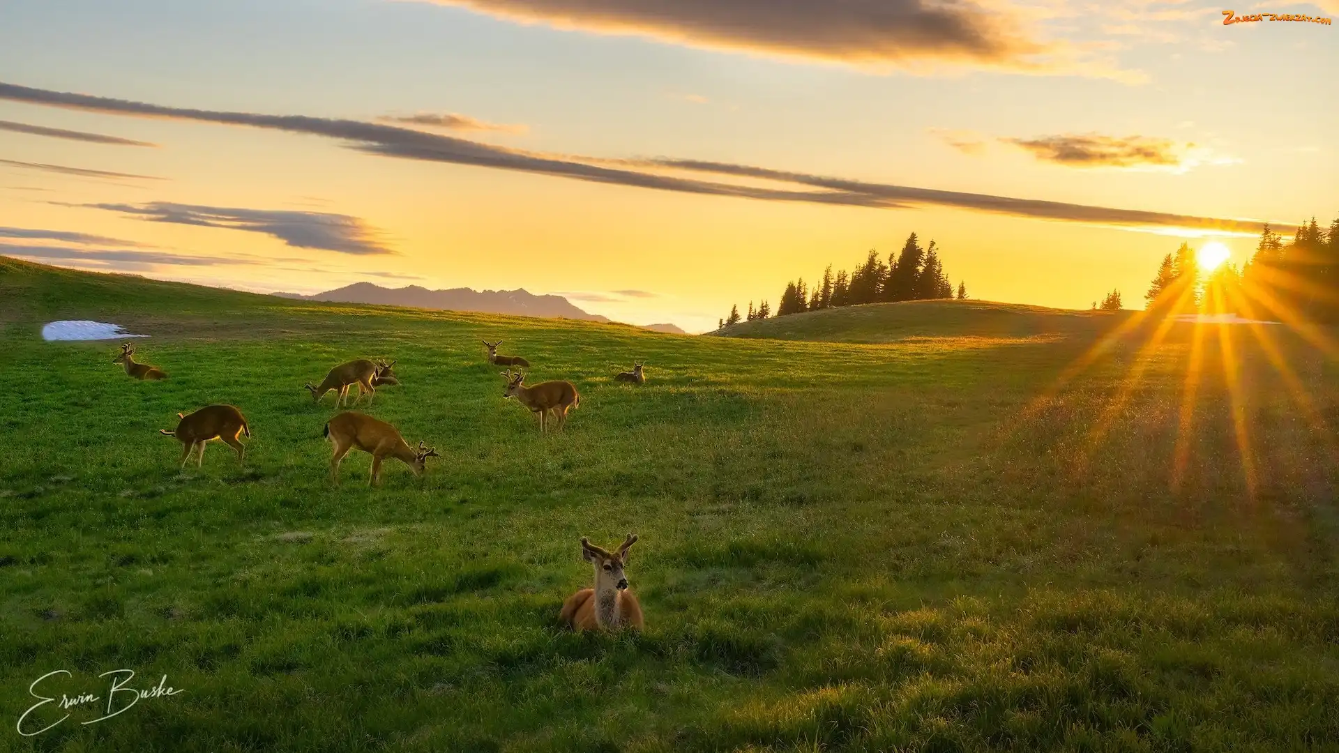 Zdjęcie: Stany Zjednoczone, Jelonki, Wschód słońca, Stan Waszyngton, Park Narodowy Olympic, Polana, Promienie słońca, Sarny |