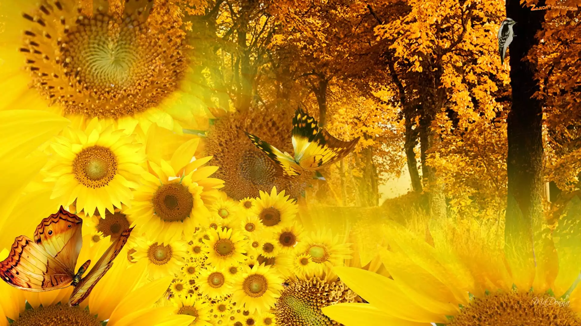 Zdjęcie: Motyle, Słoneczniki, Drzewa