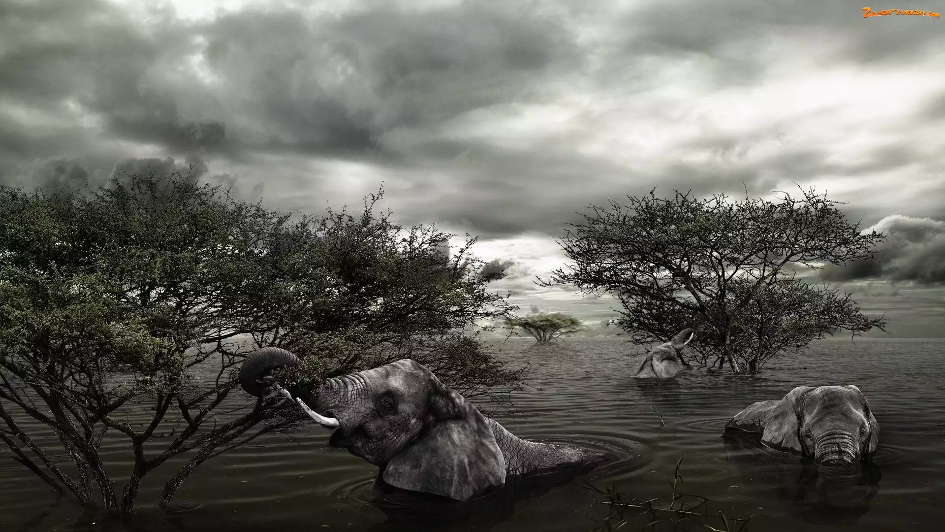 Zdjęcie: Słonie, Chmury, Powódź, Drzewa