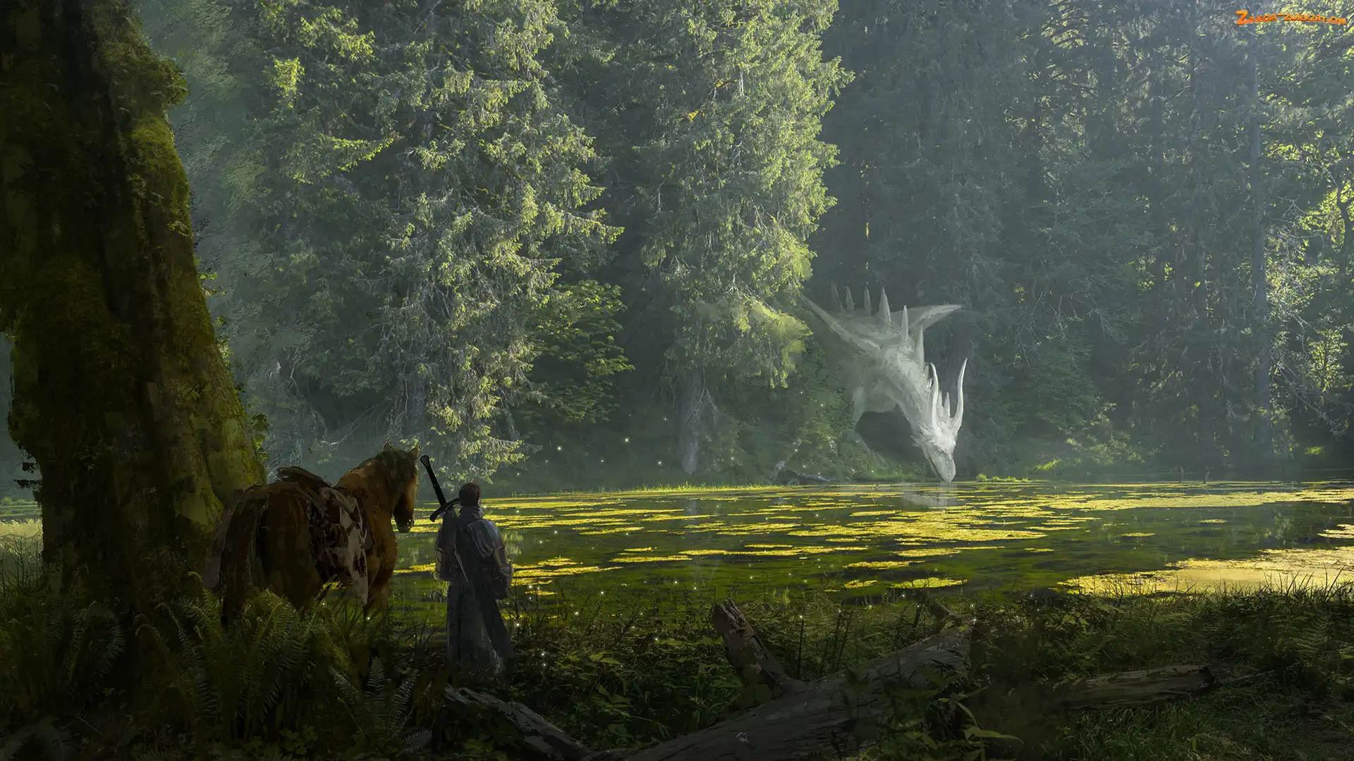 Zdjęcie: Smok, Rzeka, Fantasy, Wojownik, Drzewa, Koń