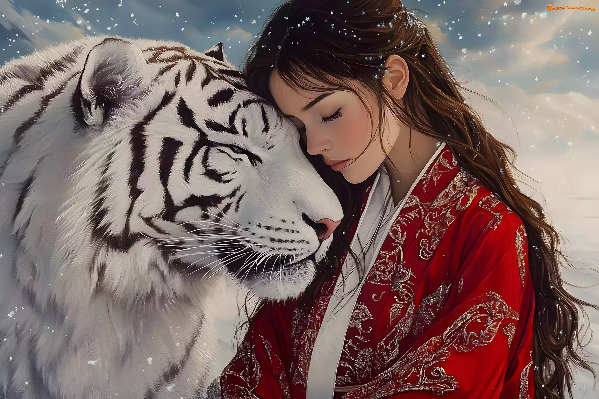 Zdjęcie: Tygrys, Kobieta, Czerwone, Biały, Grafika AI, Ubranie, Śnieg