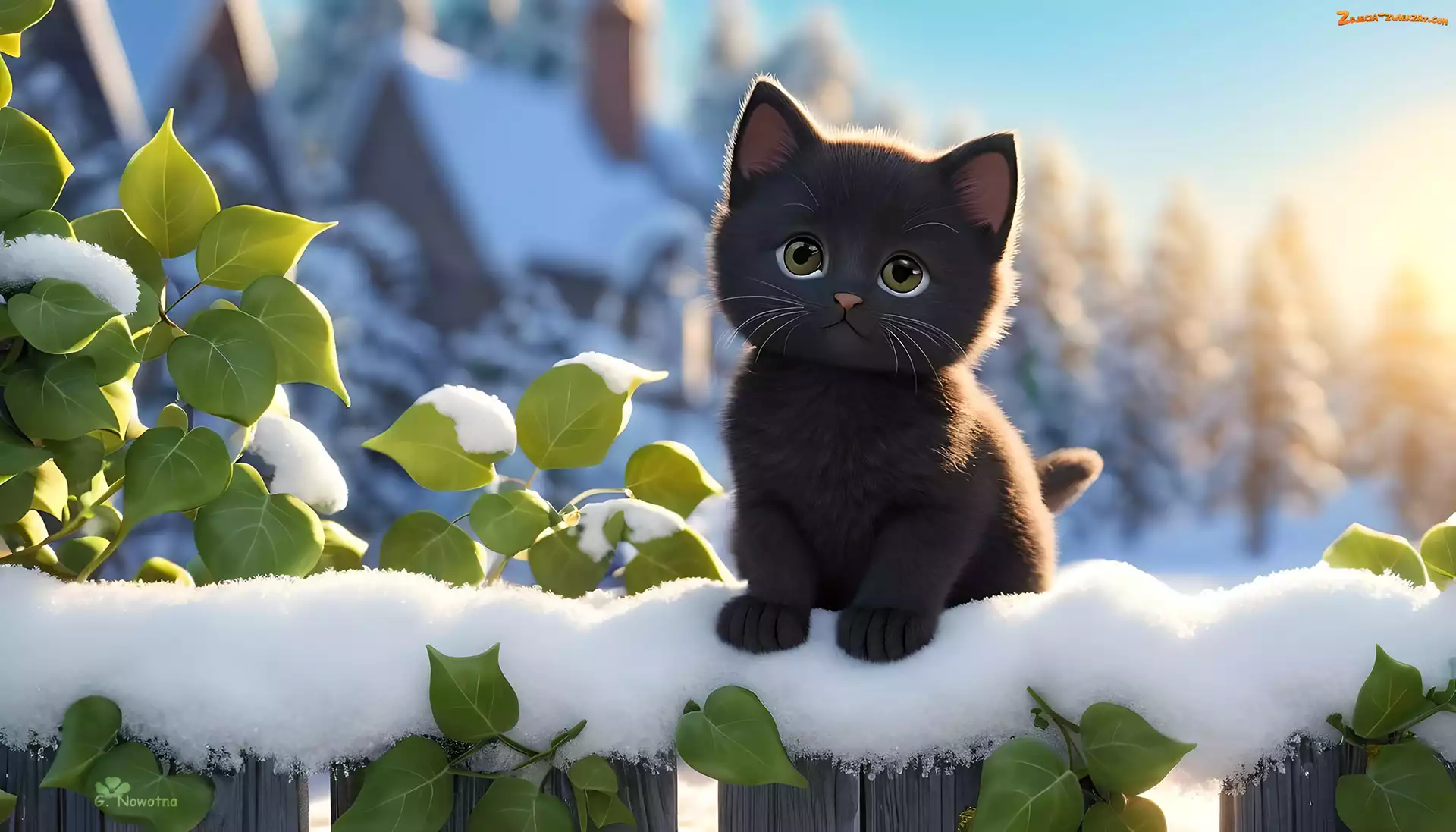 Zdjęcie: Liście, Śnieg, Grafika, Czarny, Kot