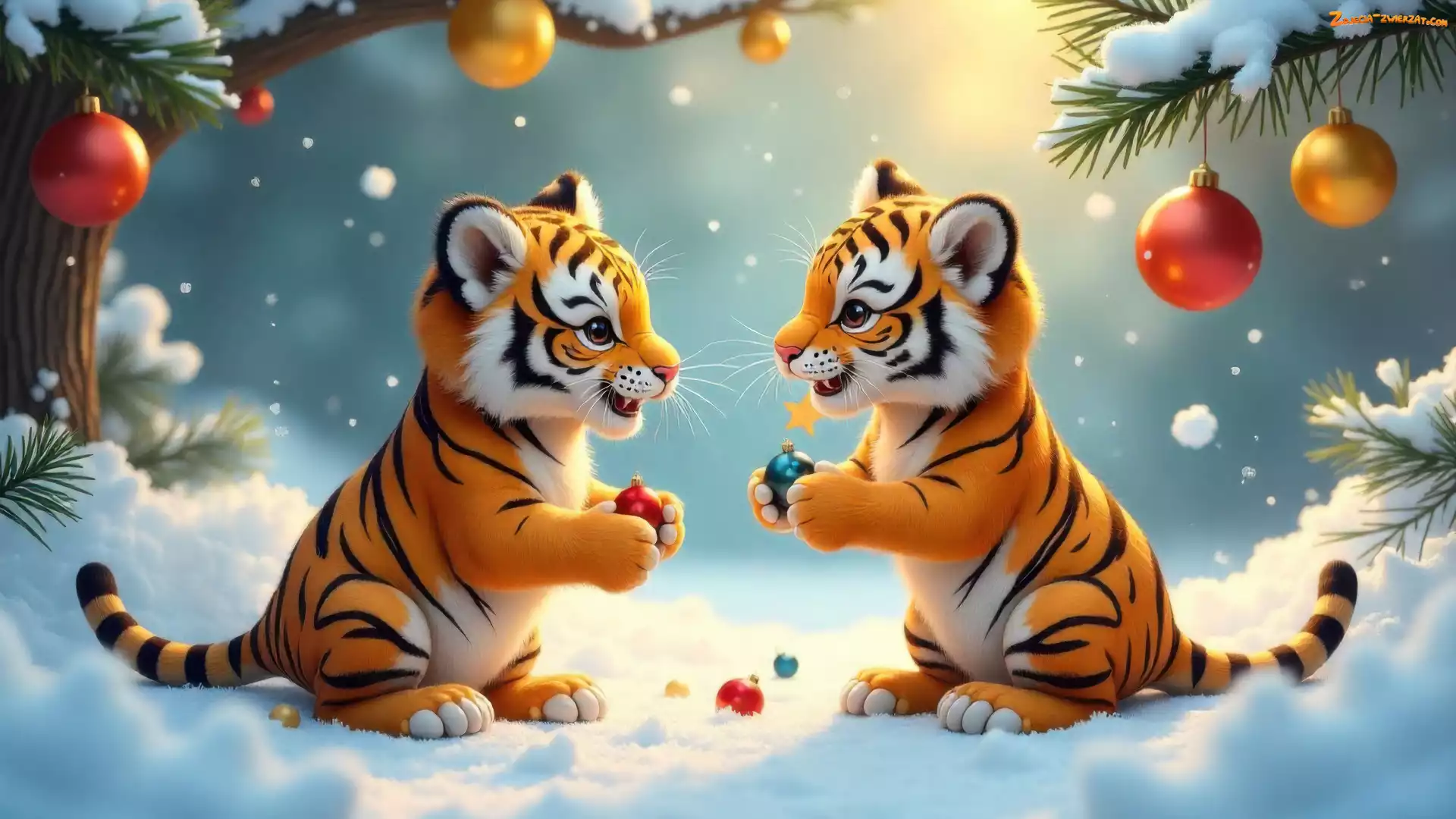 Zdjęcie: Gałązki, Tygrysy, Młode, Śnieg, AI, Zima, Bombki
