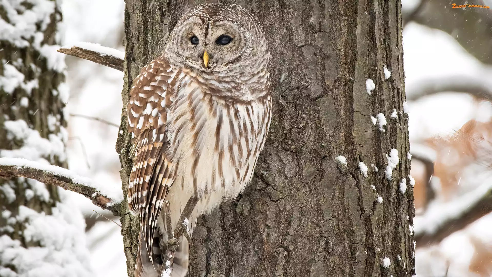 Zima, Drzewo, Śnieg, Sowa, Puszczyk kreskowany