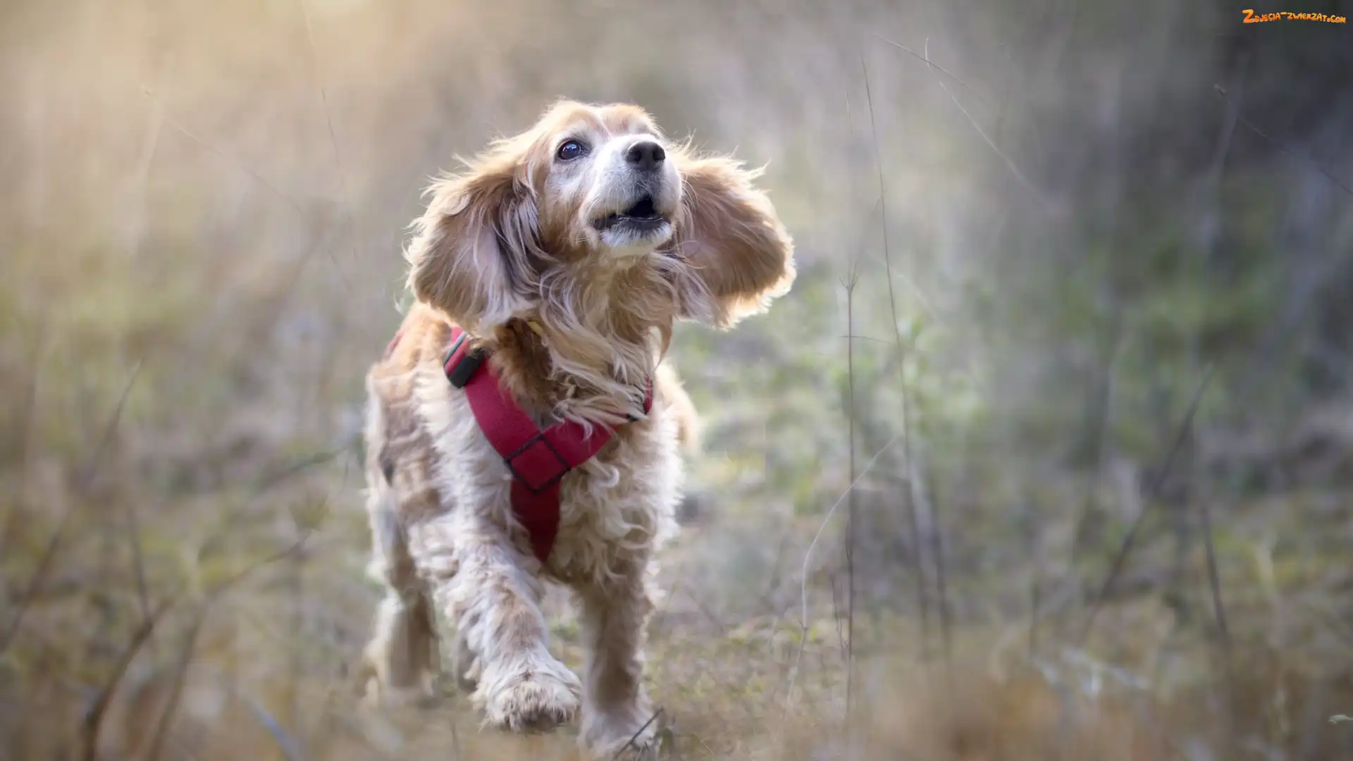 Zdjęcie: Cocker spaniel angielski, Pies, Łąka, Rozmyta, Biegnący, Szelki