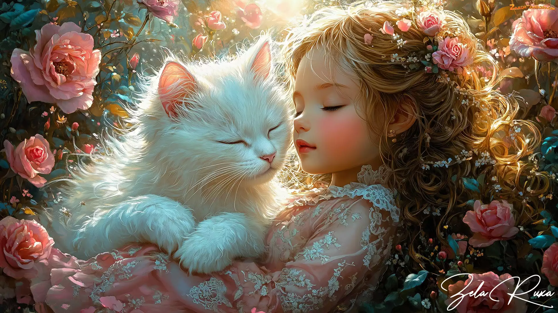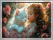 Zdjęcie: Grafika AI, Biały, Śpiąca, Dziewczynka, Kot, Kwiaty