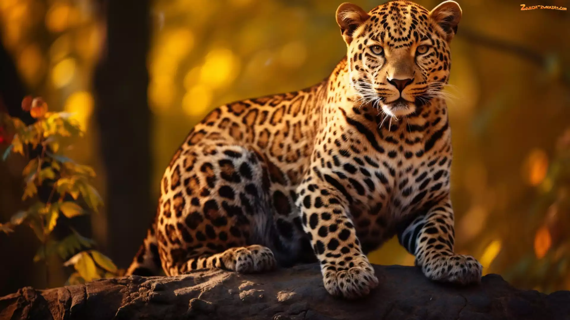 Jaguar, Siedzący, Liście, Spojrzenie