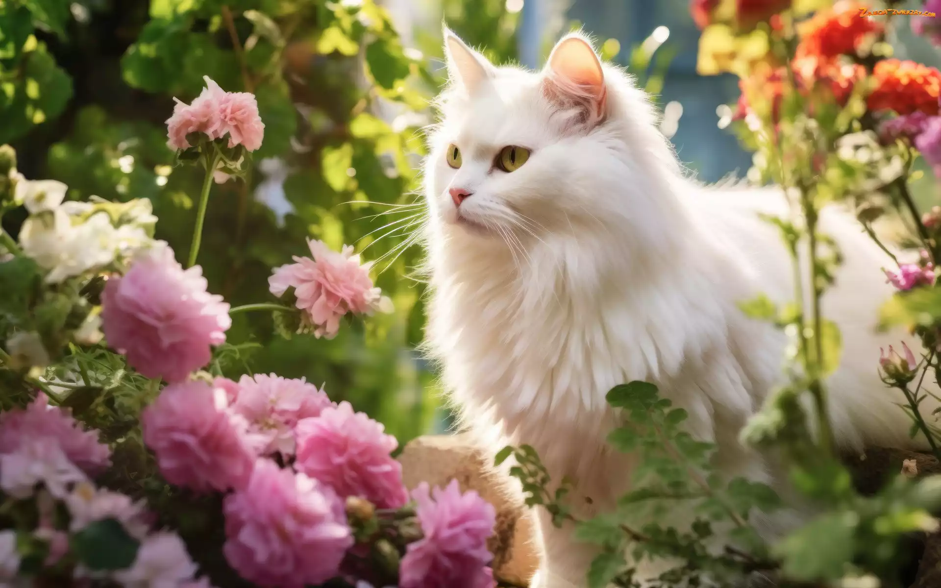 Zdjęcie: Kot, Biały, Kwiaty, Spojrzenie