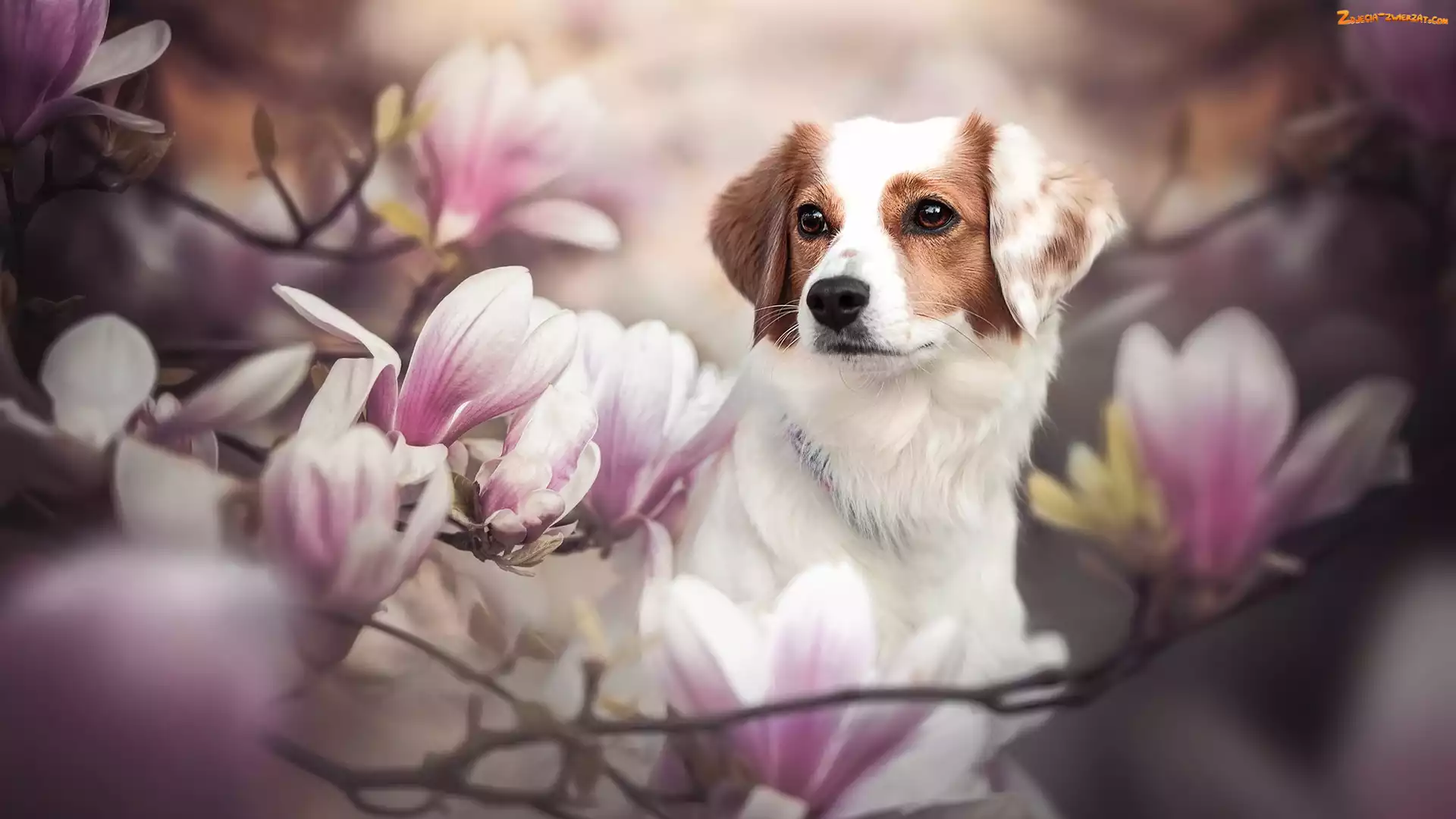 Zdjęcie: Kwiaty, Spojrzenie, Magnolie, Pies, Płochacz