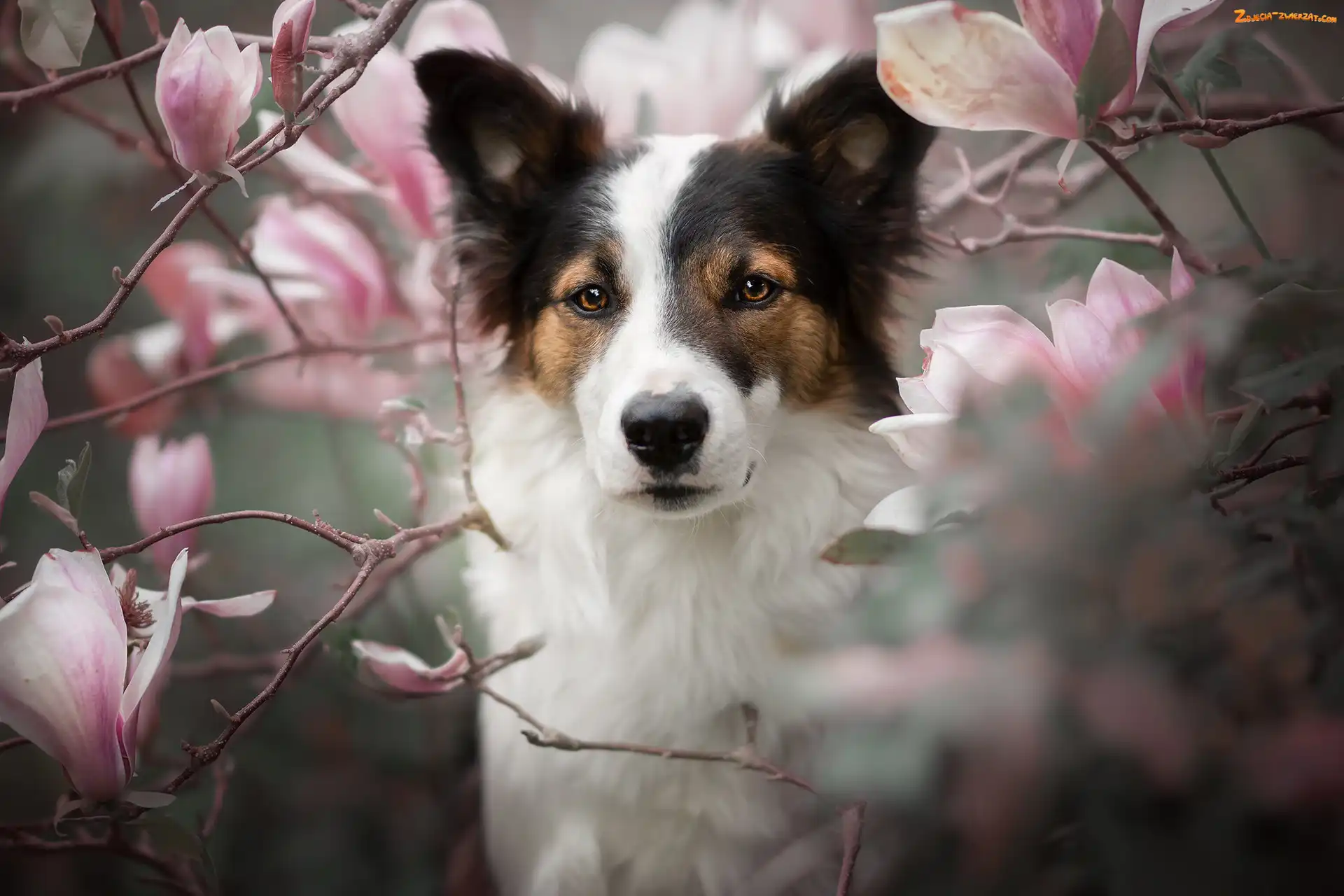Zdjęcie: Spojrzenie, Magnolie, Pies, Kwiaty