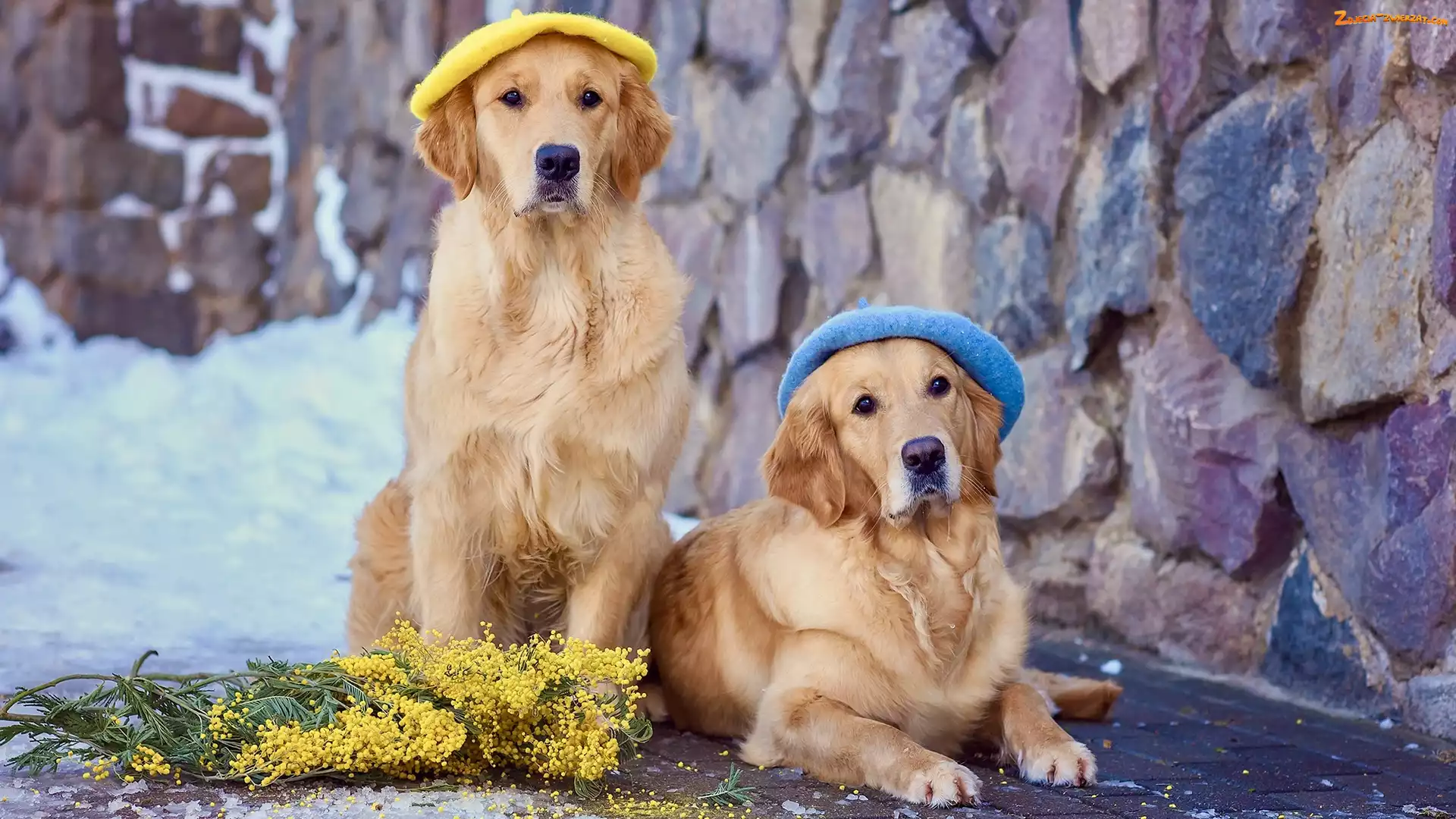 Śnieg, Berety, Psy, Golden retrievery, Gałązki, Akacja srebrzysta