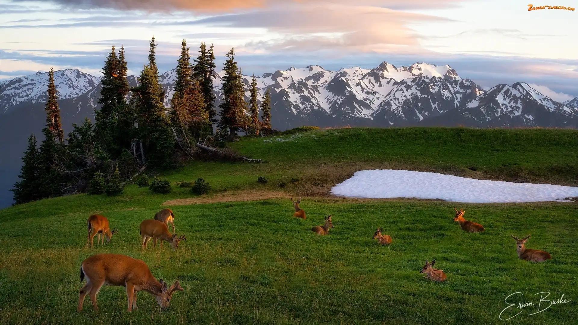 Zdjęcie: Stany Zjednoczone, Polana, Śnieg, Sarny, Stan Waszyngton, Góry, Ośnieżone, Park Narodowy Olympic, Drzewa, Szczyty, Jelonki |