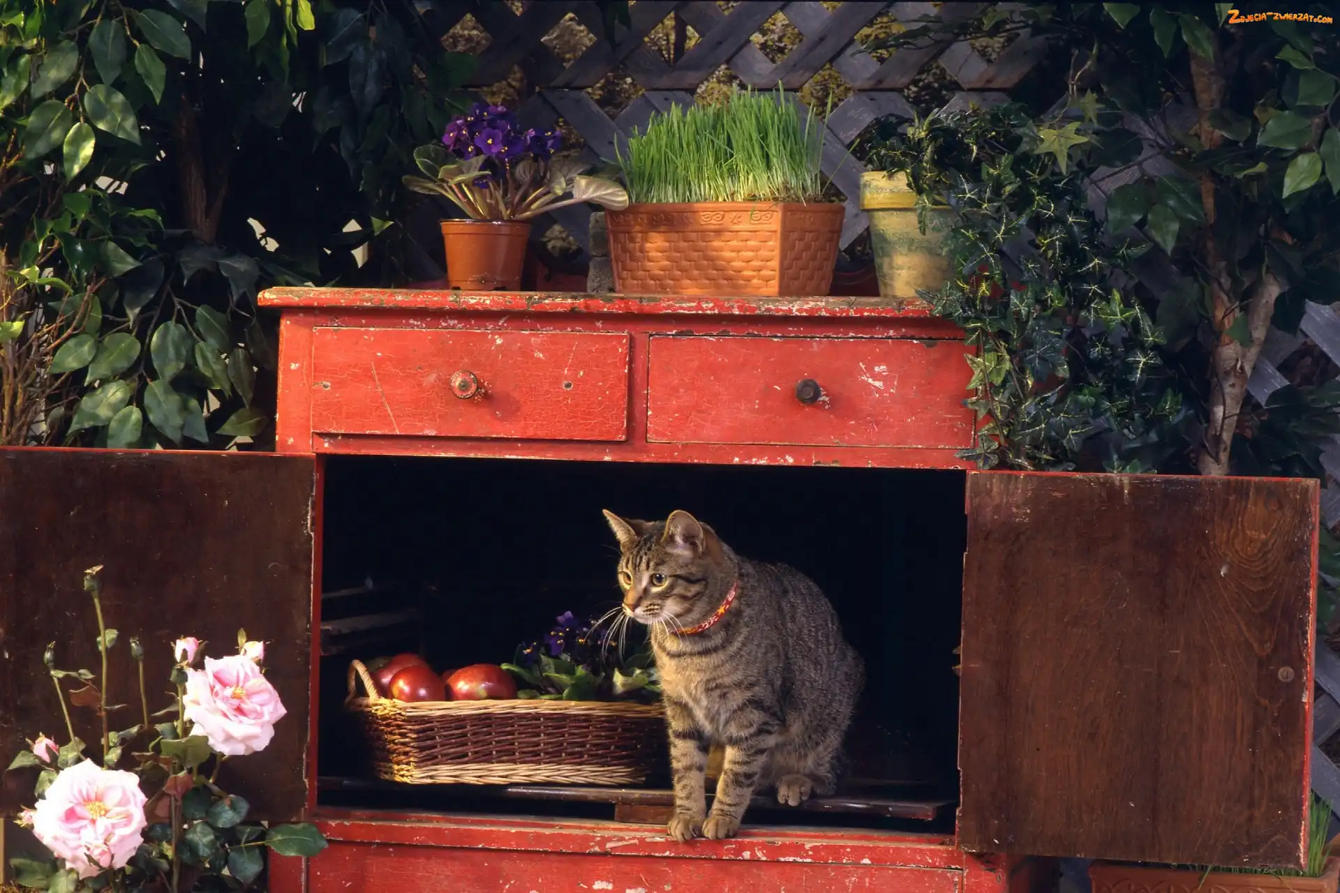 Zdjęcie: Stara, Kwiaty, Kot, Szafka