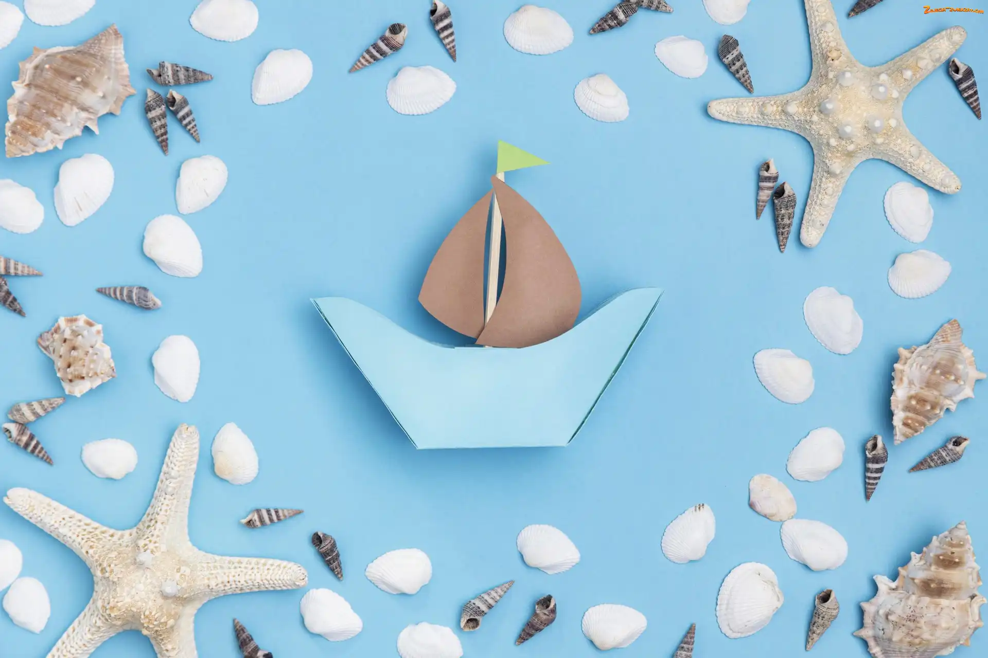 Zdjęcie: Statek, Rozgwiazdy, Kompozycja, Tło, Muszelki, Niebieskie