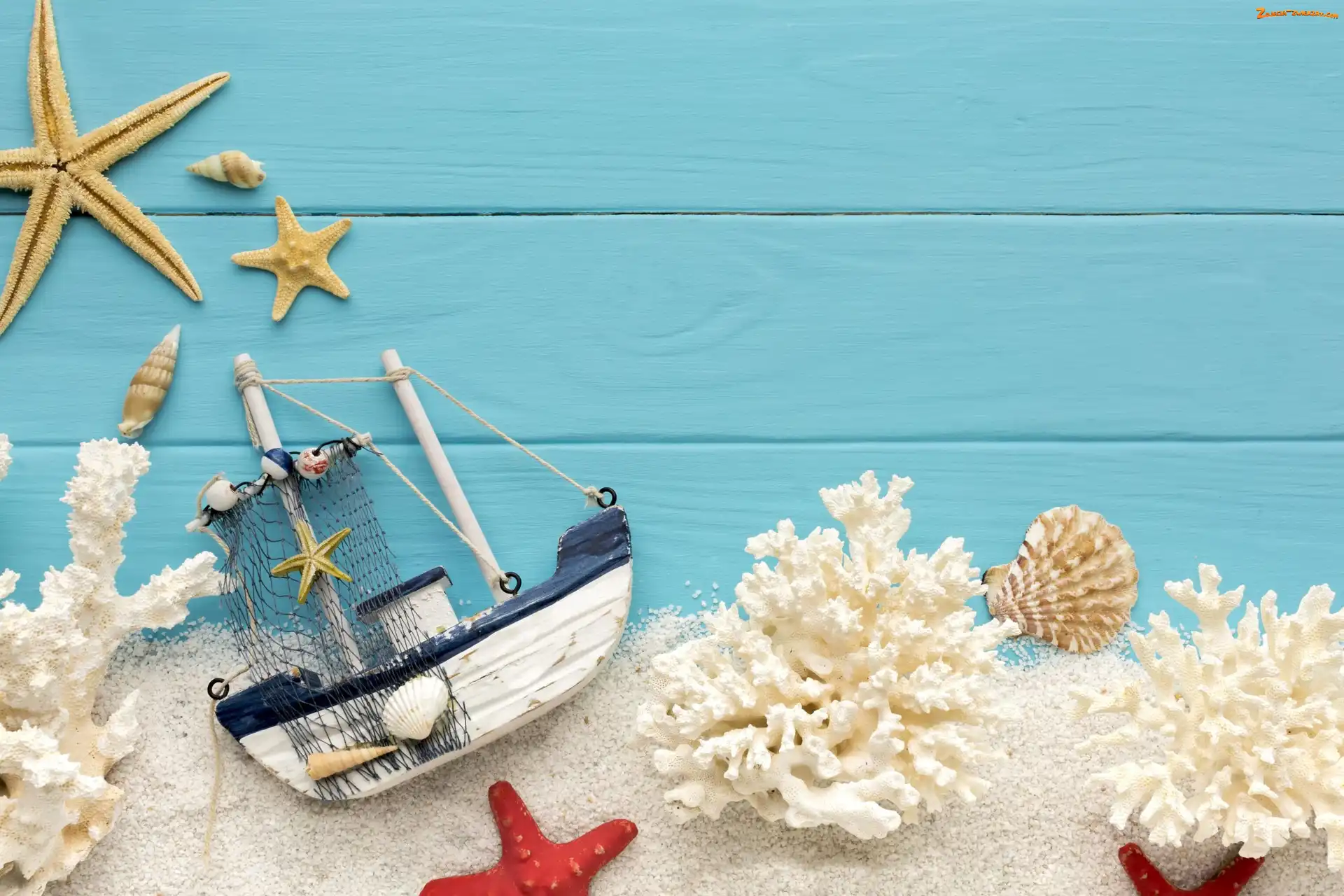 Zdjęcie: Statek, Muszelki, Kompozycja, Koralowce, Rozgwiazdy, Piasek