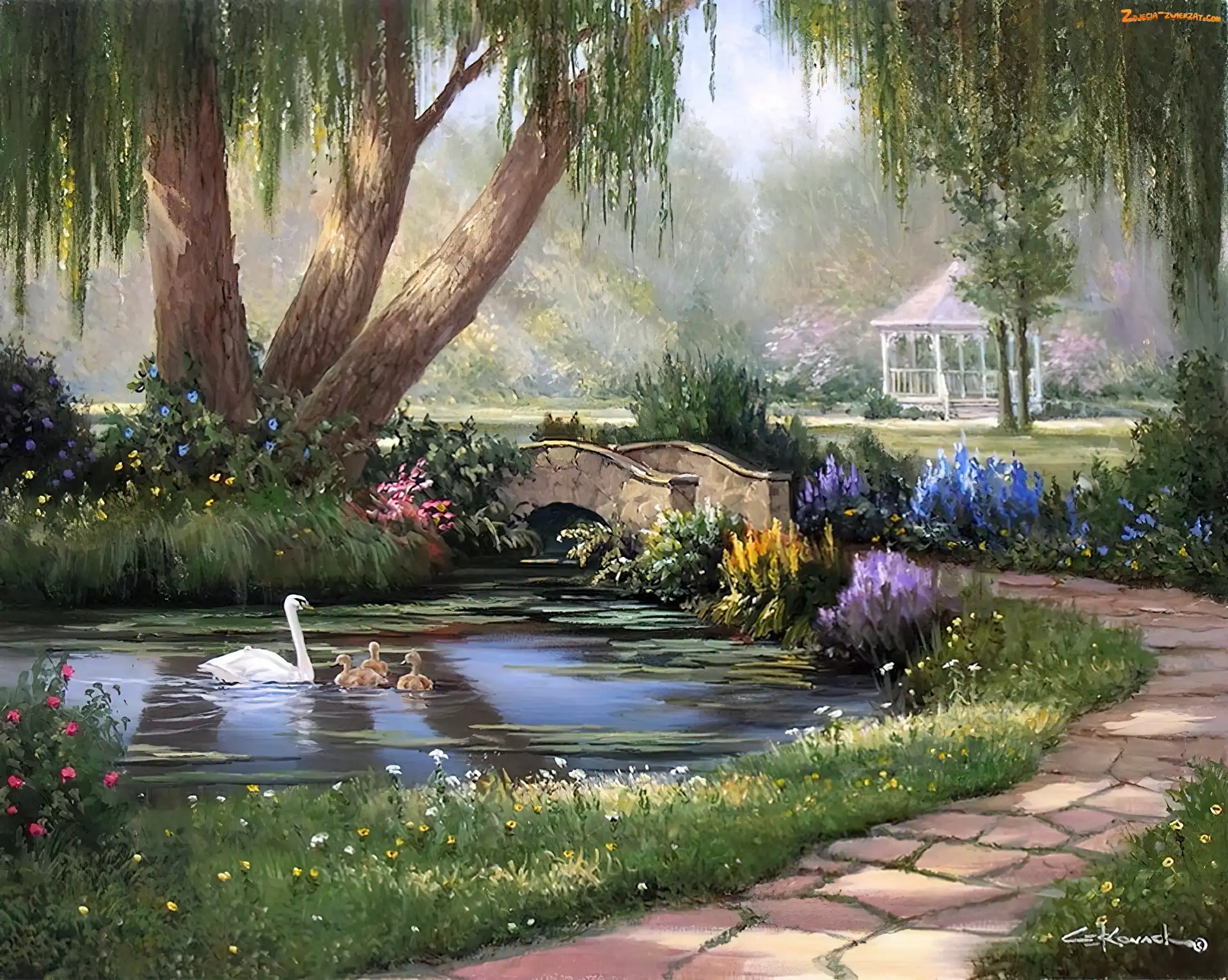 Łabędzie, Malarstwo, Staw, Widoczek
