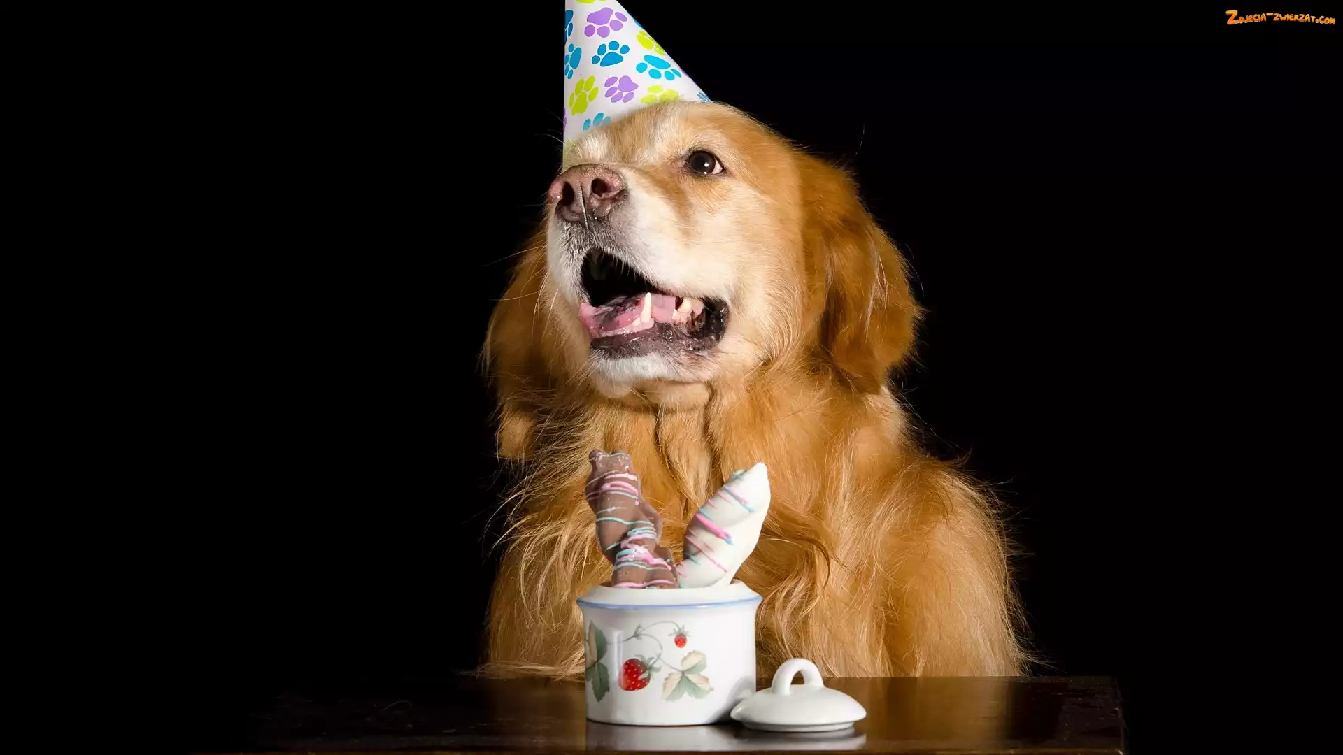 Zdjęcie: Stół, Słodkości, Golden retriever, Pies, Czapeczka
