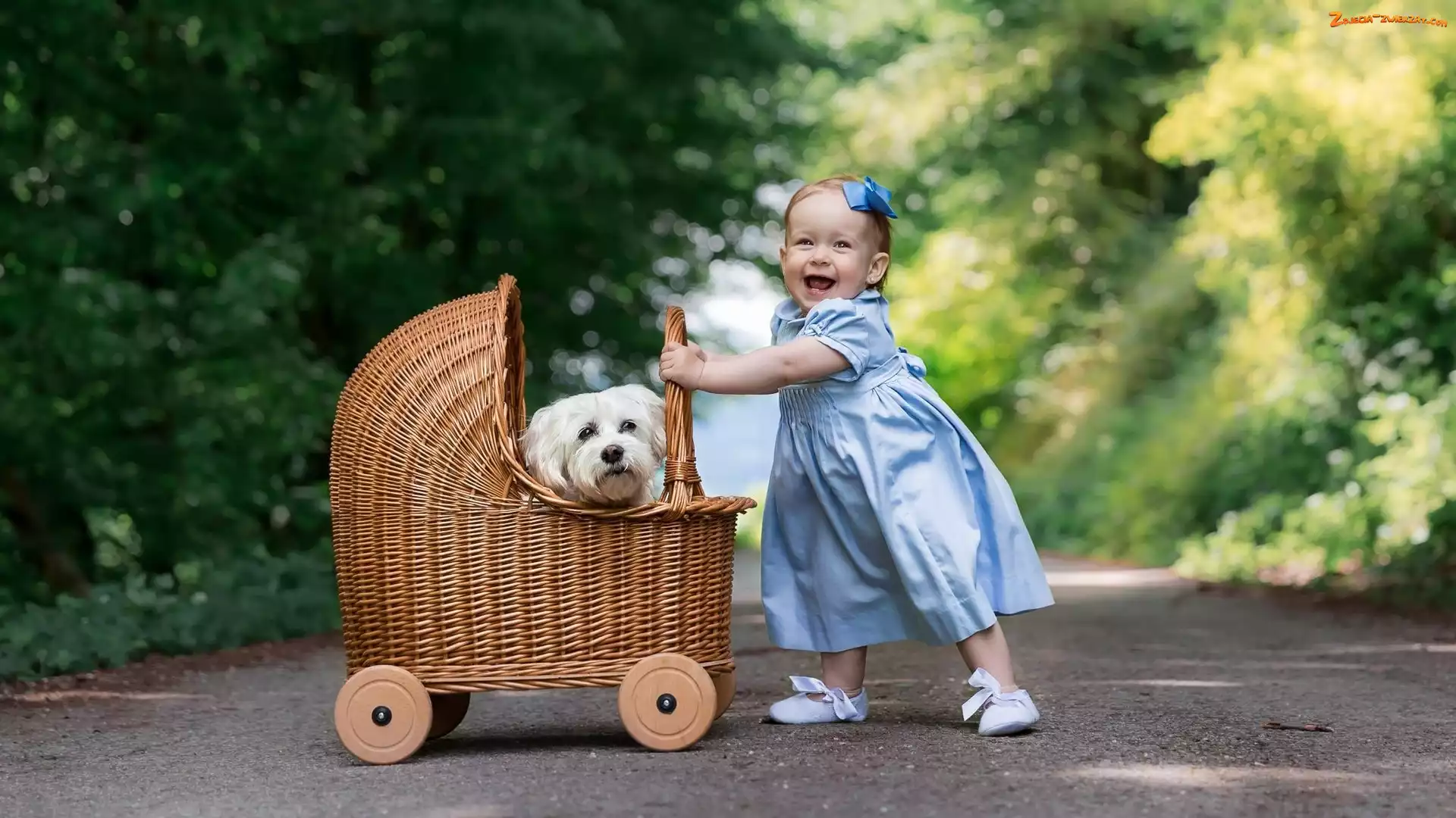Zdjęcie: Sukienka, Dziewczynka, Maltańczyk, Pies, Niebieska, Wózek